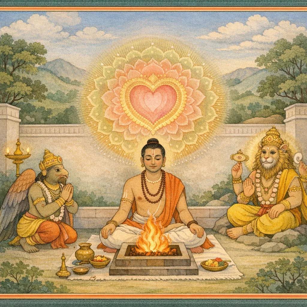 The salutations map the ritual cosmos: supportive principles (Dharma, Jñāna, Vairāgya, Aiśvarya) are honored as foundations of sādhana, while their opposites are acknowledged as forces to be transcended. The sequence functions as an inner audit, aligning the practitioner with the sattvic supports before proceeding to mantra-installation and homa.