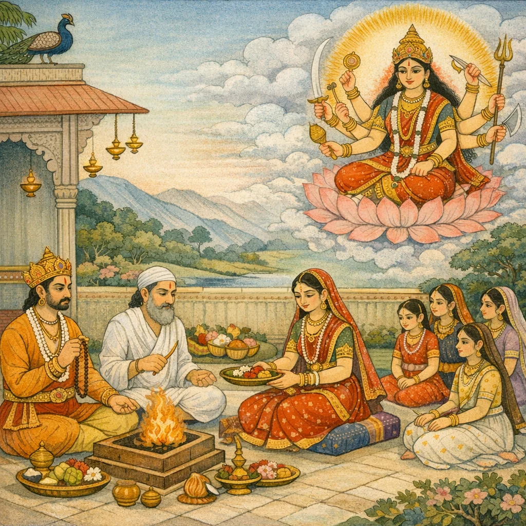 It explicitly links a king’s desire for victory over enemies to disciplined practice—japa, homa, and feeding a maiden—suggesting that political success is to be pursued through dhārmic restraint, propitiation of the Devī, and meritorious giving rather than mere force.