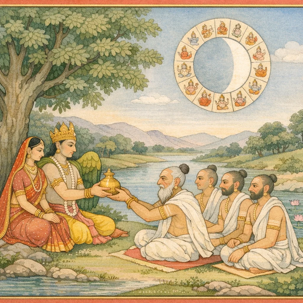 By honoring the prescribed deities on every tithi (lunar day), one attains both worldly enjoyment and final liberation (mukti). On Pratipadā (the first lunar day), Agni is worshiped as the giver of wealth; and the Aśvins—Nāsatya and Dasra—are also worshiped.