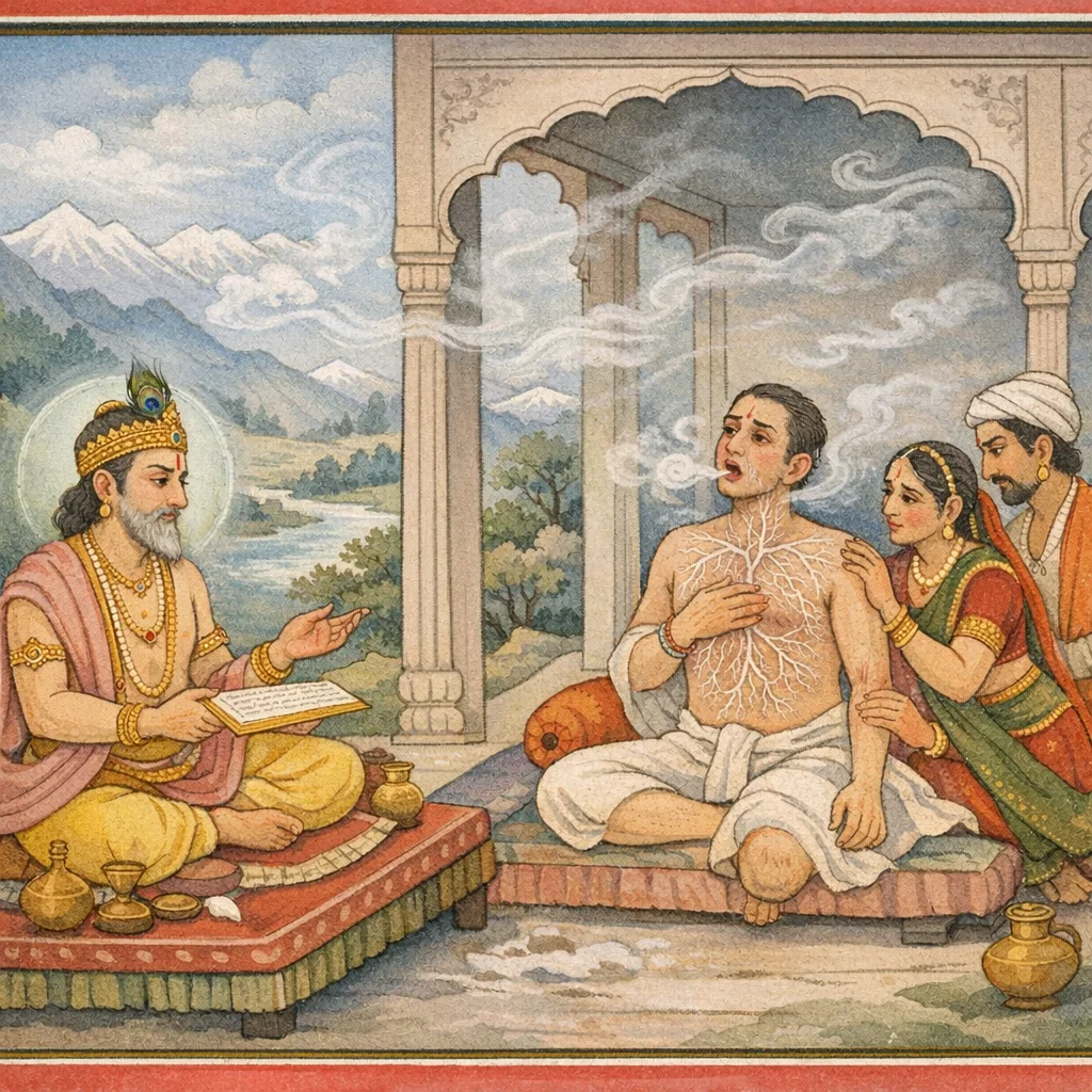 Continuing the Brahma Khanda’s medical-encyclopedic thread in the Garuḍa Purāṇa, Dhanvantari turns from general causation to the nidāna of śvāsa (dyspnea). He lists triggers—cough-aggravated doṣas, gastrointestinal upheaval, toxins, fevers, environmental irritants, marma injury, and cold-water exposure—and classifies five types, stressing kapha obstructing prāṇa-vāyu and srotas pollution in the chest. From pūrvarūpa (premonitory signs) the condition rises stepwise: reverse vāyu movement, cough with throat rattle, faintness, catarrh, orthopnea, parched mouth, and cold-worsened attacks. He distinguishes a yāpya, manageable state in strong patients from refractory cases with fever and syncope, and ends with grave ariṣṭa signs—delirium, loss of radiance, upward gaze, blocked urine and stool, phlegm clogging mouth and ears, and marma-piercing pain—preparing for the next chapter’s move into cikitsā (treatment).
