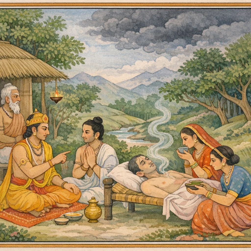 In the Purāṇic–Āyurvedic teaching style, Dhanvantari instructs Suśruta on the nidāna (causes) of hikkā (hiccup), first linking its root cause with that of śvāsa (dyspnea) and stressing recognition of prodromal signs and prakṛti-based variants. He lists distinct vāyu-driven forms and common provocations—rough, irritating foods, hunger-born spasms, and exertion after eating and drinking in equal measure—producing mild, softening hiccups that may subside with a small intake. The teaching then turns to a delayed, ominous form associated with “Yama’s attendants,” which worsens during digestion and eases only when digestion is complete. The Yamalā/Veginī/Pariṇāmavatī subtype is marked by tremors of head and neck, delirious speech, vomiting, diarrhea, rolling eyes, yawning, sensory impairment, paralysis-like weakness, loss of speech and memory, and a crushing, serpent-like force rising from the navel/intestinal region. Cautions are offered for the aged and the chronically wasted, and the chapter concludes that hikkā and śvāsa often appear at life’s end, joining clinical prognosis to Purāṇic contemplation of mortality.