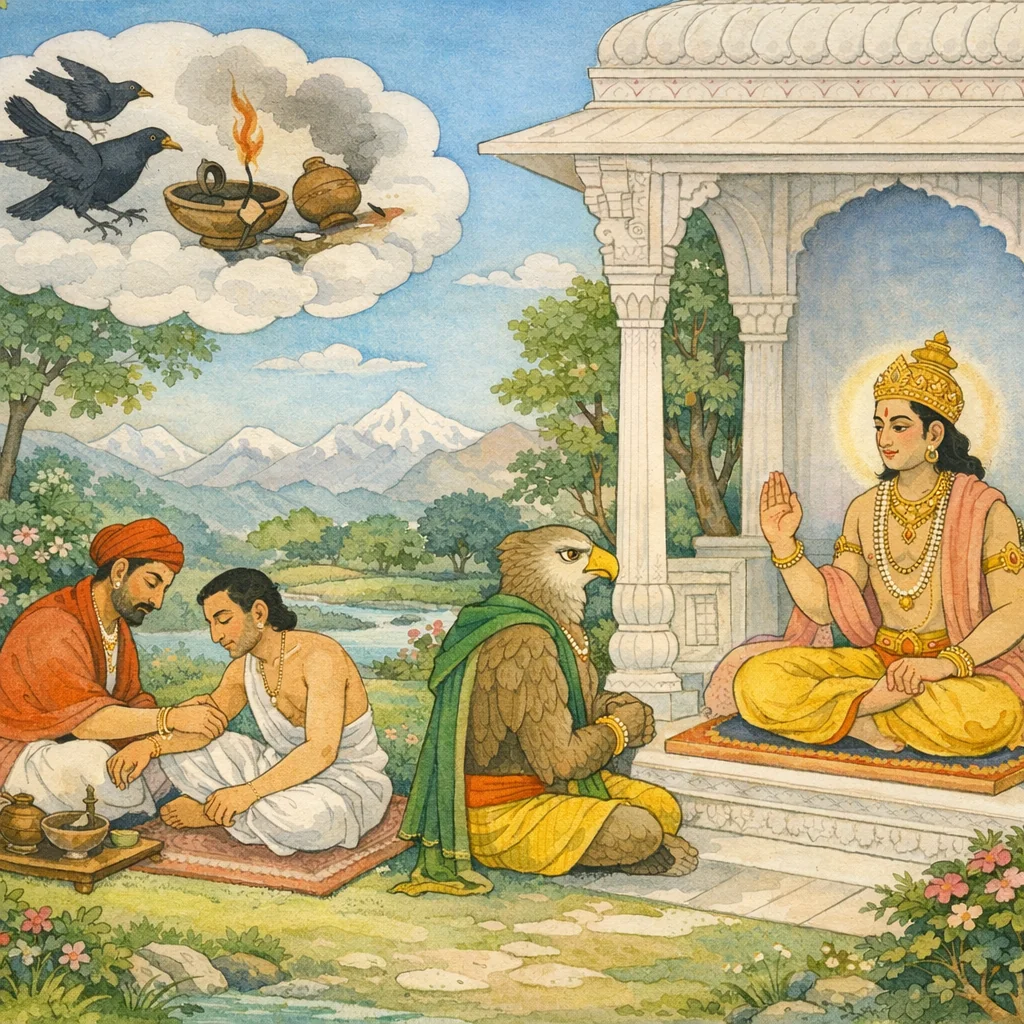 Continuing the Garuda Purana’s Brahma Khanda focus on applied dharma through bodily health, Dhanvantari turns from general medical teaching to a concentrated nidāna of rājayakṣmā (yakṣmā/kṣaya/śoṣa). He defines the disease as a “sovereign” affliction of wide reach, then traces its rise to the drying of the dhātu beginning with rasa, driven by rash exertion, suppression of natural urges, and depletion of semen/ojas and unctuousness. He describes tridoṣa disturbance—vāta initiating systemic disorder, channel obstruction or excessive discharge, followed by cardio-thoracic pain, coryza, fever, anorexia, nausea, vomiting, pallor, and progressive weakness. Ominous dreams and strange perceptions are given as prognostic signs of decline. Symptom clusters are distinguished by vāta, pitta, and kapha dominance (burning, diarrhoea, haematemesis, catarrh, heaviness, weak agni), ending with a practical rule: when extreme wasting and loss of faculties appear, avoid treatment; otherwise, treat. Thus the chapter sets diagnostic thresholds and doṣa-based presentations for the therapies that follow.