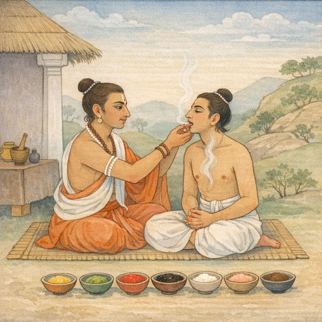 With noisy belching and a violent, difficult breathing that grows worse with every moment, there arises a swift affliction—cough, dryness of the mouth, and a vāta (wind) disorder that brings pain and strain to the voice.