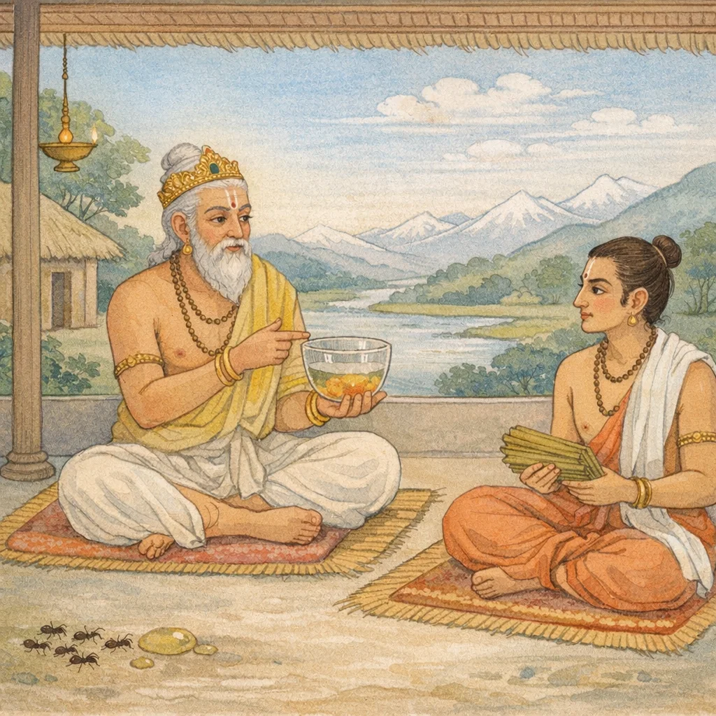 In udaka-meha (water-type prameha), the urine is slightly turbid and slimy. In ikṣu-meha (sugarcane-type prameha), the urine becomes exceedingly sweet—like sugarcane juice.