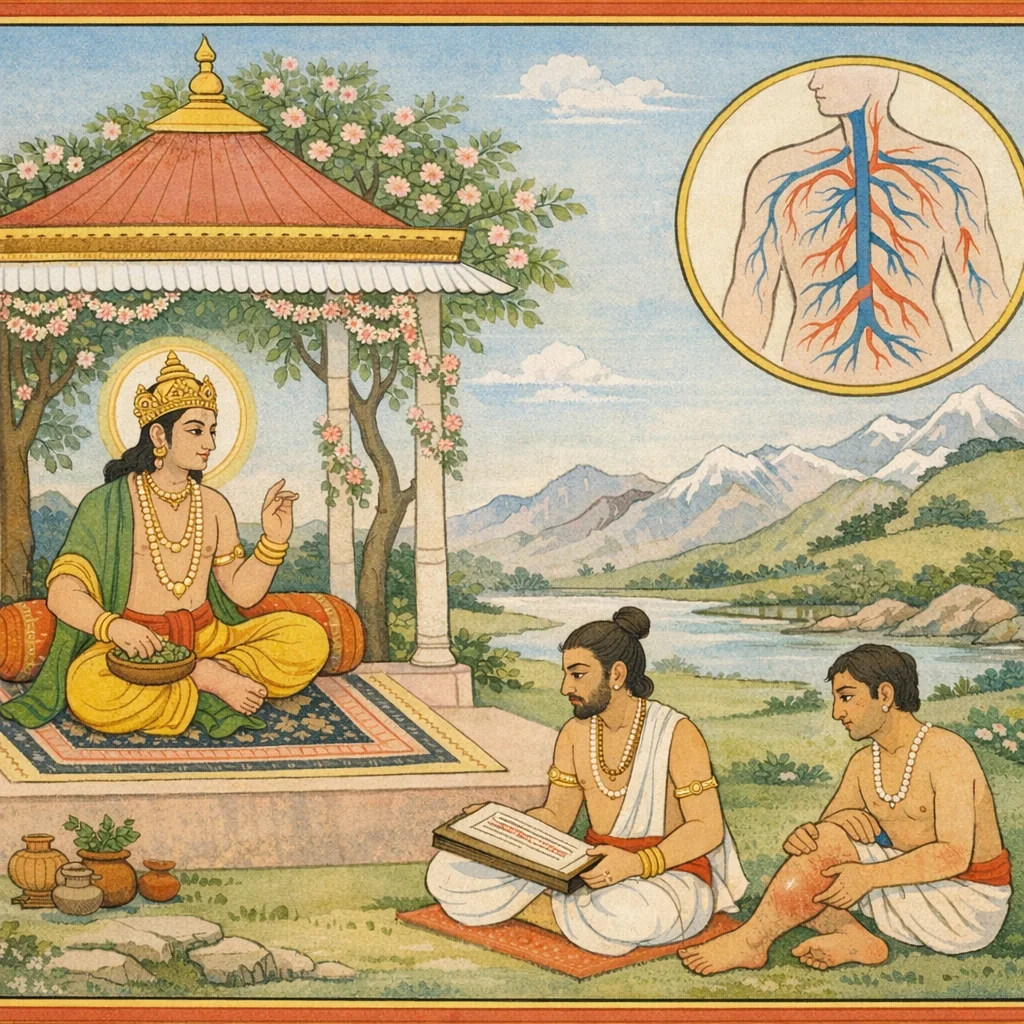 Continuing the Brahma Khanda’s Ayurveda instruction in the Garuda Purana, Dhanvantari teaches Suśruta the nidāna (causes) and lakṣaṇa (signs) of pāṇḍu and śotha. He explains how aggravated doṣas—especially pitta—move through the nāḍīs, vitiate rasa and other dhātus, and produce turmeric-yellow discoloration, heaviness, āma-related tissue laxity, and systemic weakness. He then distinguishes vāta-, pitta-, and kapha-dominant forms, notes mixed or obscured signs in severe cases, and warns of complications such as wasting, abnormal stools, pitta-following edema, and progression into kumbha-kāmalā and halīmaka. Turning to śotha as pāṇḍu’s chief associated feature, he defines it through channel obstruction and nicaya-type consolidated swelling, classifies edema into nine kinds (including traumatic and toxic), and lists dietary, behavioral, exertional, and poison-related causes. The chapter ends with prognosis: soft, mobile, recent swellings are curable, while deep-seated, internally driven edema tends toward incurability, preparing for the therapeutic chapters that follow.
