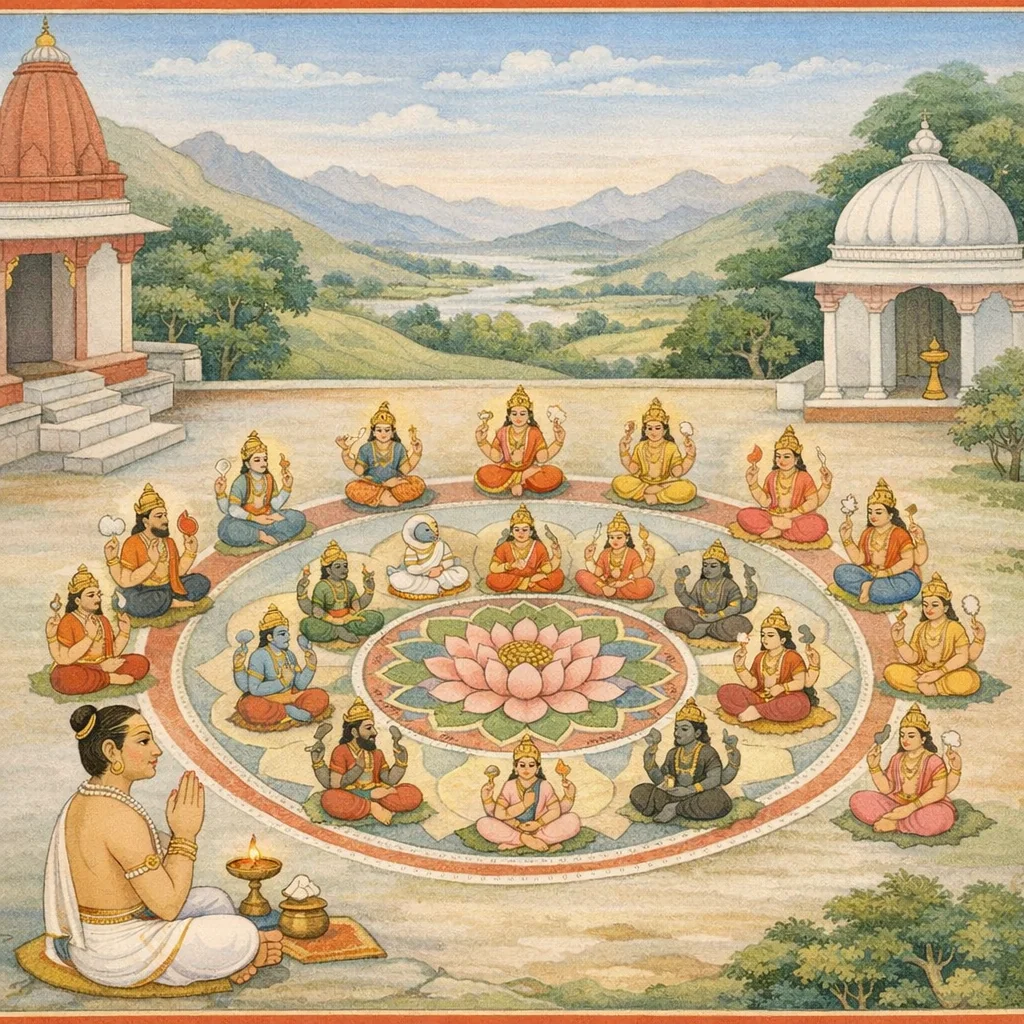 The eight-petalled lotus functions as the ritual mandala-body (adhiṣṭhāna) for installing Sūrya’s presence. It provides a structured locus for invocation, enclosure-based worship, and directional placements, turning an ordinary space into an ordered sacred field.
