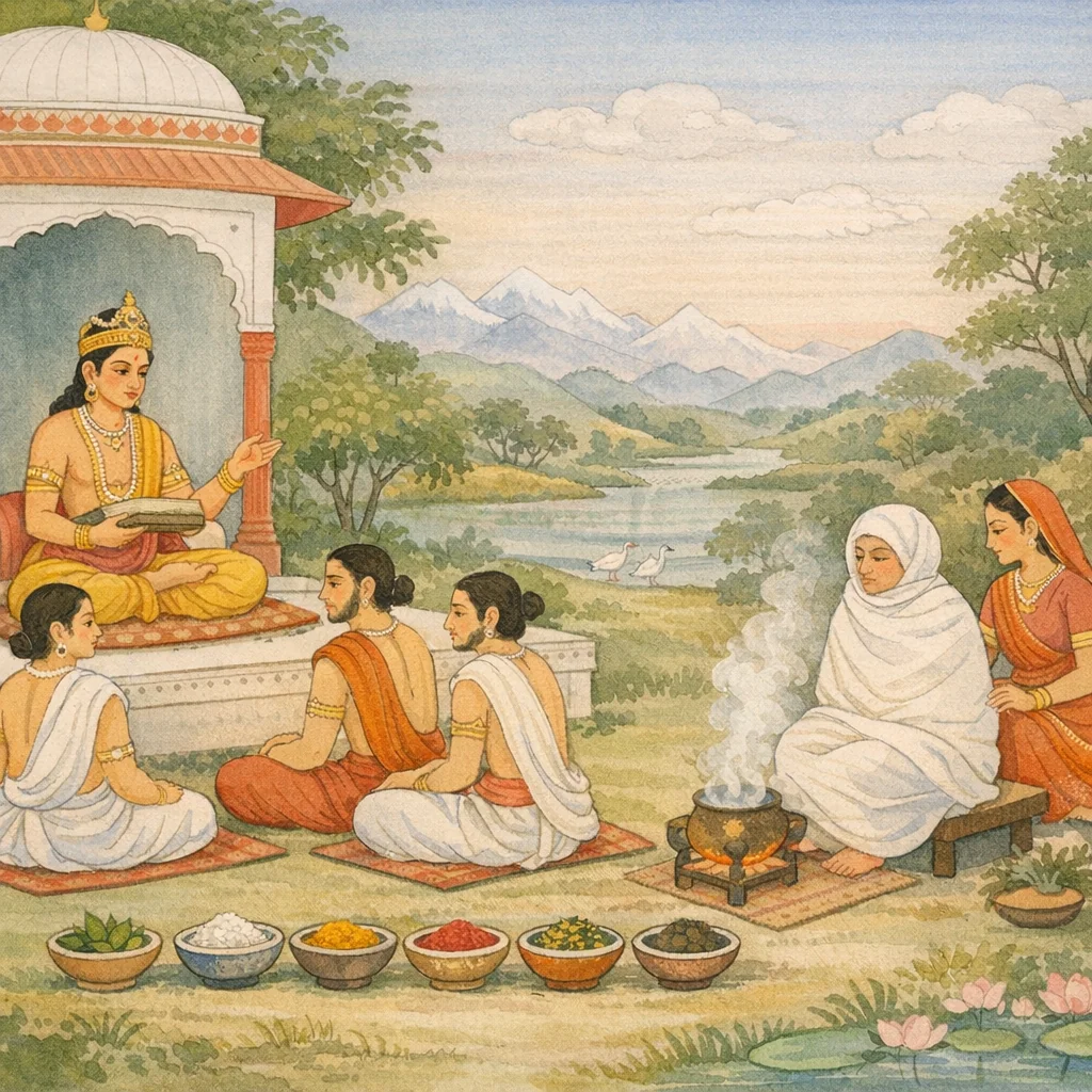 Continuing Dhanvantari’s medical teaching, this chapter organizes diet and medicine by the six tastes (rasa). It begins with the madhura (sweet) group—grains, dairy, nourishing juices, honey, and certain fruits/tubers—describing benefits such as easing burning and fainting and clarifying the senses, and noting external lepa (pastes) for respiratory troubles and glandular swellings. It then lists āmla (sour) fruits and fermented items as digestive aids, warning that excess causes burning, worsens wounds, and sensitizes teeth. Next are lavaṇa (salts/alkalis), cleansing and digestive yet obstructive to bodily channels when overused. The chapter proceeds through kaṭu (pungent) and tikta (bitter) herbs that reduce kapha and kindle appetite, though they can dry the body, and then kaṣāya (astringent), absorbent and healing but harmful in excess to the heart and by dryness. It expands therapeutic groupings (including daśamūla) and turns to procedure: ghṛta as the foremost sneha, doṣa-based combinations, dosing by patient strength, signs of proper oleation, and svedana (sudation/heat) rules with clear contraindications—bridging to the therapies discussed next.