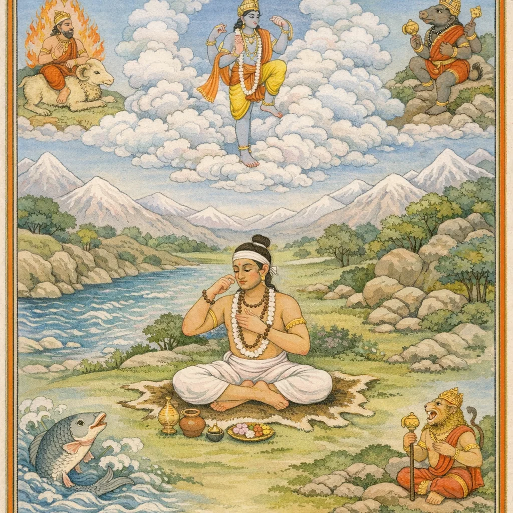 Purāṇic kavacas often distribute protection through multiple nāmas and rūpas to cover different realms and vulnerabilities; each avatāra symbolizes a specific mode of divine intervention (e.g., Matsya in waters, Narasiṃha against fear/hostility), creating a comprehensive protective grid.