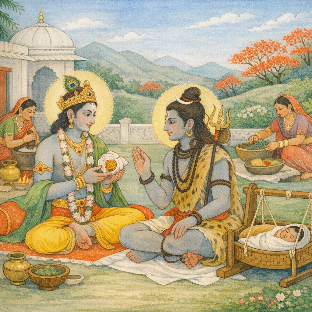 If one always wears, as protective amulets, śaṅkha-nābhi, vacā, kuṣṭha, and iron, it becomes Rudra’s protection, guarding children from afflictions and contagious influences.
