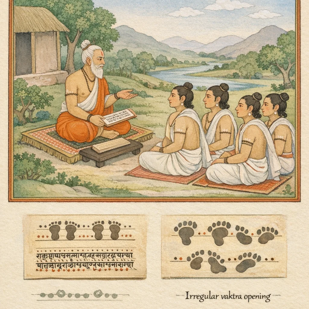 In this metre, the seventh syllable from the beginning should be short (hrasva); in the second half, after the ‘śara’ pattern, the closing cadence is ‘trigaṇāṅghri’. The line is then ‘pathyā’ (regular), and when the ‘vahnilaṅghana’ (“overstepping the fire”) constraint is exceeded, it is called ‘vipulā’ (the expanded variation).