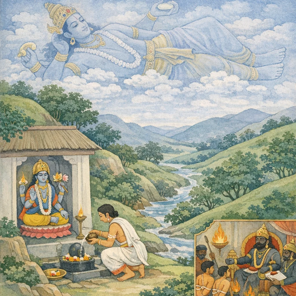 Continuing the Ācāra-khaṇḍa’s practical teaching, Sūta gives an essential and easy method of worshiping Hari (Viṣṇu): offer flowers and water while reciting the Puruṣa-sūkta. He expands this into a cosmic truth—since Viṣṇu pervades the universe and impels the activity of all beings, worship of Him honors all existence. The chapter then turns to karmic and post-mortem accountability, warning that neglect of Viṣṇu is a grave sin that brings Yama’s rebuke and hellish suffering. Yet it also stresses mercy and accessibility: when offerings are lacking, even water alone is sufficient. Contrasting divine aid with the limited support of family, it concludes by placing bhakti above external rites and worldly attainments as the root of true fulfillment and fellowship with the liberated, leading naturally into further disciplines and their spiritual results.