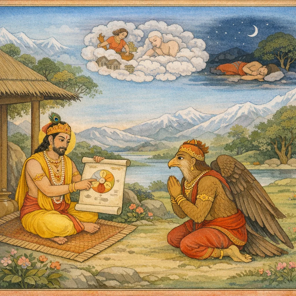 Continuing the Garuḍa Purāṇa’s teaching style, the Lord presents a graded account of manifestation: from Brahman to space, air, fire, water, and earth, and then the rise of the subtle apparatus—organs of action and perception, mind, intellect, and the five prāṇas. He explains pañcīkaraṇa as the process by which subtle elements become the gross cosmos and gross body, while affirming that effect is not separate from cause (pot and clay). Turning inward, the jīva is shown as the witness of waking, dream, and deep sleep, and the aspirant is urged to steady discernment so samādhi begins by dissolving the “field” of superimposed experience. The chapter culminates in explicit non-dual instruction: Brahman as eternal pure consciousness, and the mahāvākyas “tat tvam asi” and “ahaṁ brahmāsmi,” leading from cosmology to liberating self-knowledge and sustained contemplative assimilation beyond states.