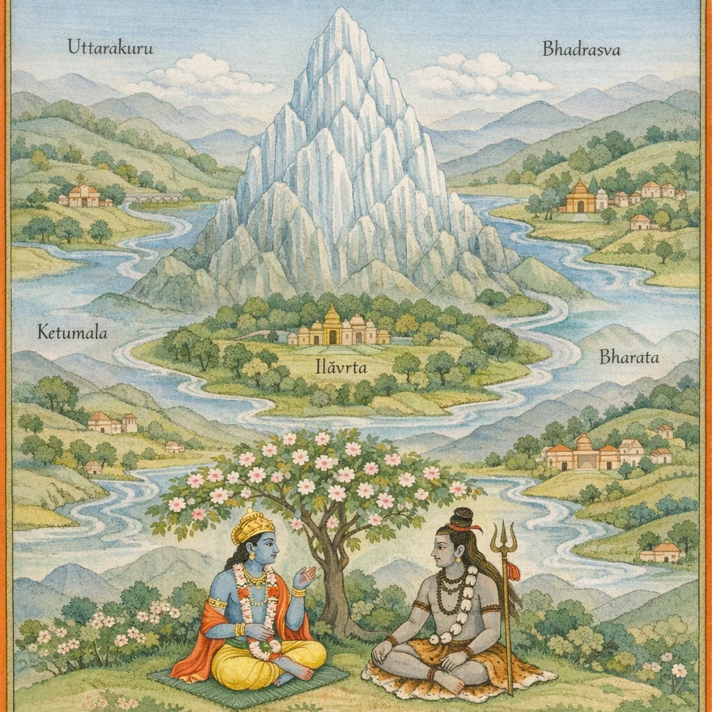 The chapter places Ilāvṛta at the center and names surrounding regions by direction: Bhadrāśva (east), Hiraṇvān (southeast), Kimpuruṣa (south of Meru), Bhārata (further south), Hari/Harivarṣa (southwest), Ketumāla (west), Ramyaka (northwest), and Kuru (north). This directional framing expresses a Meru-centered cosmology used across Purāṇic geography.