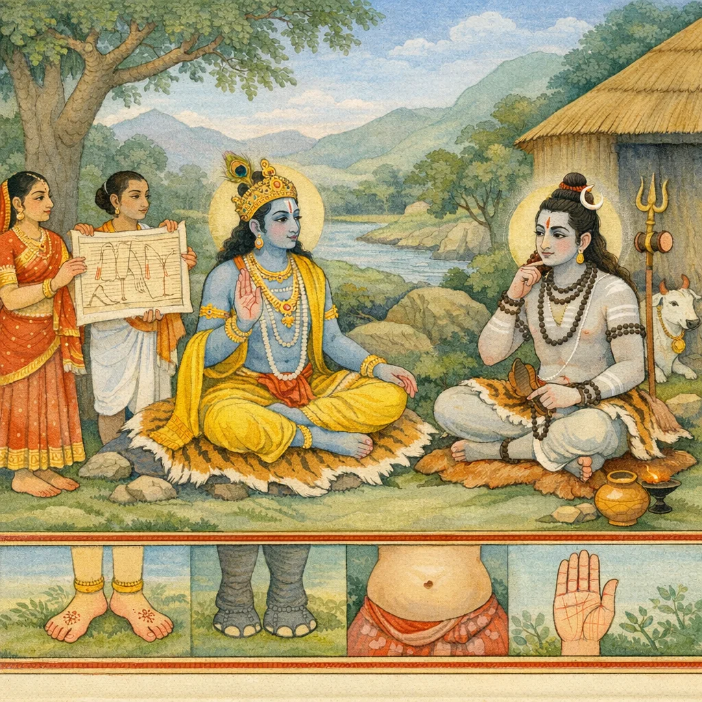 Continuing the Brahma Khanda’s Lakṣaṇa-śāstra, Hari teaches Śaṅkara/Rudra how bodily features are read as karmic signs of fortune or poverty, kingship, progeny, and lifespan. He begins with auspicious feet—soft, non-sweaty, lotus-like—and contrasts them with inauspicious deformities such as rough or pale nails, spaced toes, and contracted joints. Shanks are judged by hair and shape, with elephant-foreleg imagery marking excellence. He then links body-hair, knees, and reproductive traits to poverty, disease, children, and temperament, and notes gems as omens affecting vitality and wealth. Abdominal forms and signs in urination are next treated as indicators of prosperity or destitution. The chapter culminates in longevity diagnosis through forehead and palm lines—trident/axe marks, the number and clarity of lines, and the course and endpoints of the āyu-rekhā (life-line). It anchors the interpretive method for later chapters: external marks are read as indicators of karma, guiding worldly duty and dharmic self-correction.