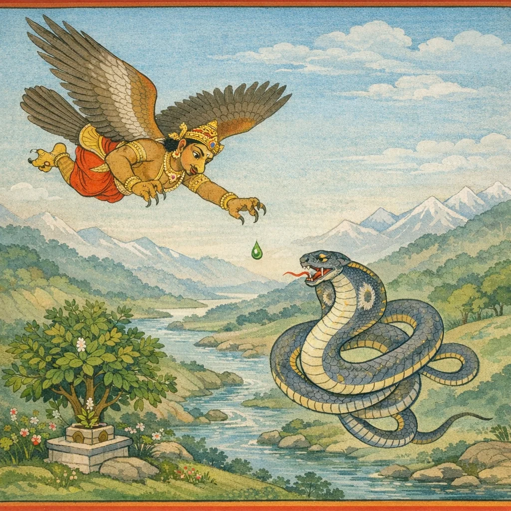 Then, with the downward beat of his wings—seeming as though he were drawing the two worlds together—Garutmān (Garuḍa) began to strike at the lord of serpents.