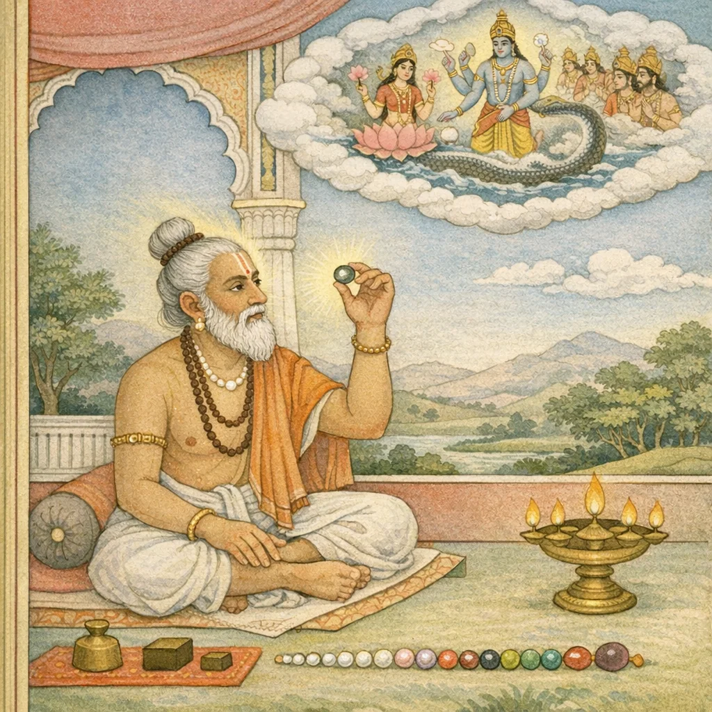 From the ocean heaving at the time of cosmic dissolution, and from a thunder-like roar—the cry of a Dānava—there arose vaidūrya (cat’s-eye), many-hued, delightful in splendor, the seed-source of brilliant colors.