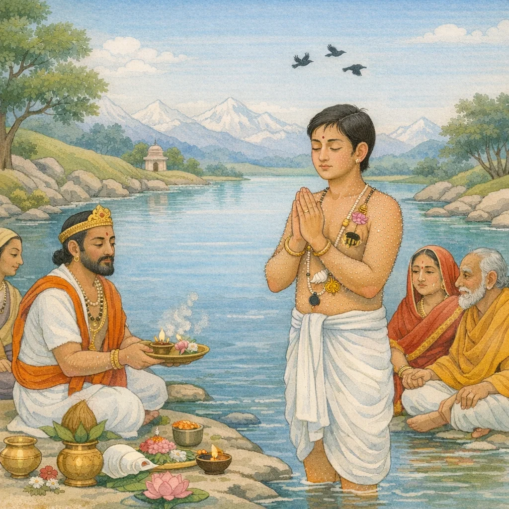 Sūta describes devotees journeying through sacred landscapes—mountains, rivers, and northern holy regions—who establish and honor a radiant manifestation, stressing tīrtha-based consecration and bhakti. The teaching then turns to śārīrika-lakṣaṇa, listing auspicious forms of pulaka (horripilation), likened to flowers, seeds, collyrium, honey, lotus-fiber, Gandharva-fire, and the glow of a plantain stem, showing that devotional feeling is read through bodily signs. Next, sacred marks or ornaments bearing conch, lotus, bee, and sun motifs, threaded with sacred cords, are praised as pure and prosperity-giving when they express devotion. The chapter ends with a warning of inauspicious nimitta: crows and flesh-smeared scavengers (dogs, jackals, wolves, vultures) are said to bring death and should be avoided, followed by a brief practical note on the stated price of a pala. Thus the lore of signs bridges tīrtha worship to broader dharma-guidance on auspiciousness and daily discernment.