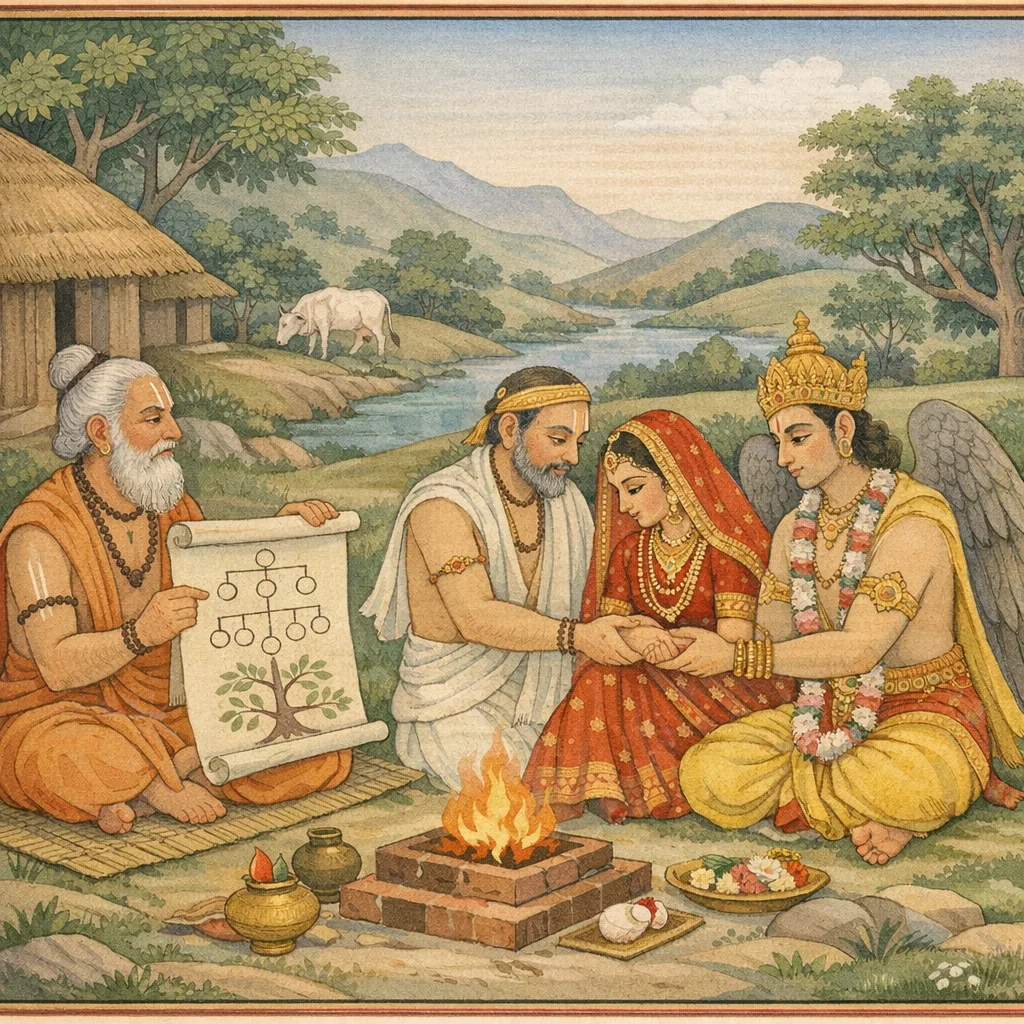 Continuing the Ācāra-kāṇḍa’s teaching of lived dharma, Yājñavalkya turns from the completion of brahmacarya to the duties of the gṛhastha. He sets norms for choosing a bride—good character, health, non-sapinda and not near in gotra, proper age—while not treating cross-varṇa unions, especially with a Śūdra wife, as the preferred standard, and he states the allowable number of wives by varṇa. The chapter lists marriage forms, praising the Brāhma marriage and ranking others (Āsura, Gāndharva, Rākṣasa, Paiśāca) with varṇa-based permissions and censures. It links righteous marriage, sacrificial fees, and charity (dāna) to the purification of generations. It then gives rules for household governance: giving a maiden in marriage, penalties for abandonment or abduction, exceptional procreation arrangements to preserve lineage (kṣetraja/niyoga-like), and discipline for adultery. Women’s ritual purity is affirmed, yet grave sins connected with adultery and foeticide are warned against. The chapter concludes with ideals of marital harmony, maintenance duties, timing of fertility, avoidance of inauspicious days, and a protective, honor-centered household order, preparing for further teachings on social and ritual conduct in gṛhastha life.