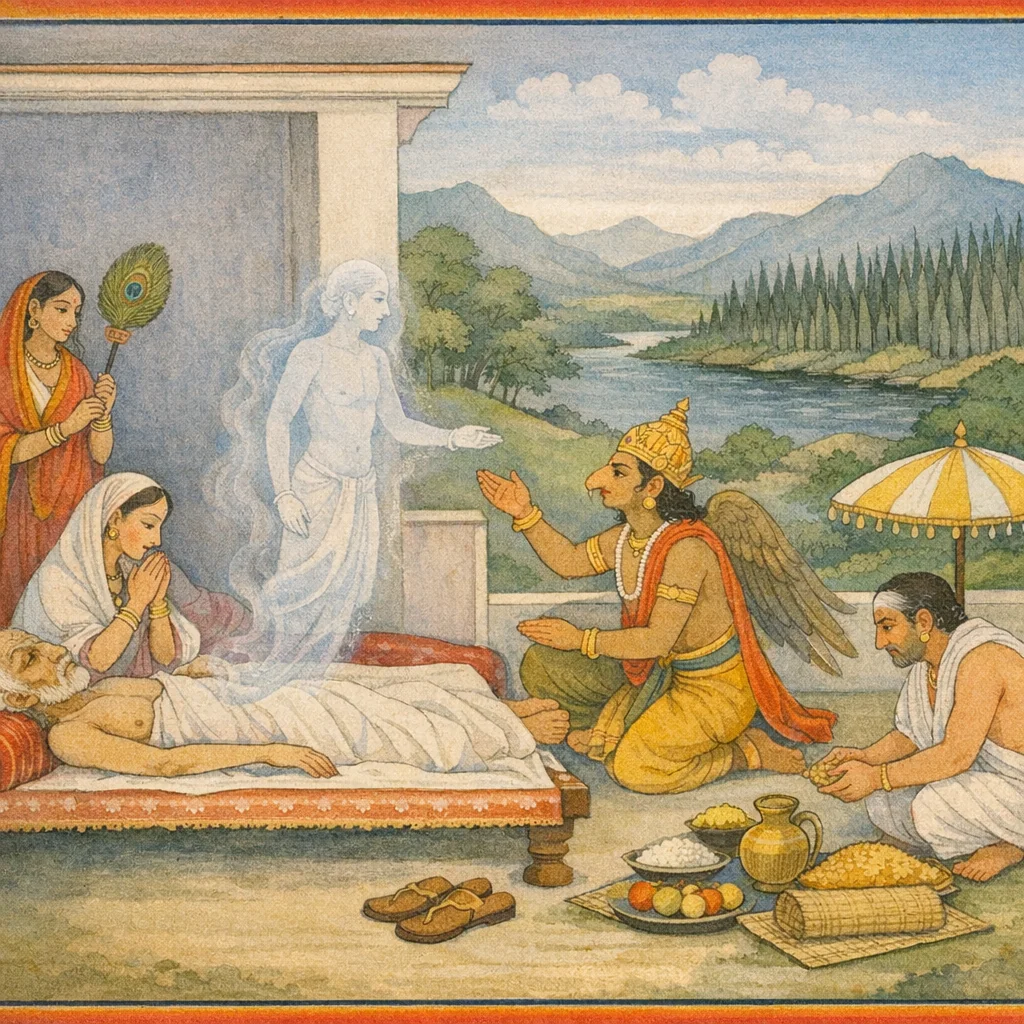 Dakṣiṇā—the ritual fee—should be given to the priestly brāhmaṇa, for it brings release from sin. Thus have I explained to you this established rite, which removes the fivefold burden. In Saṁyaminī, Yama’s realm, the rites for the dead are to be performed according to the soul’s journey and according to the passing of the year.