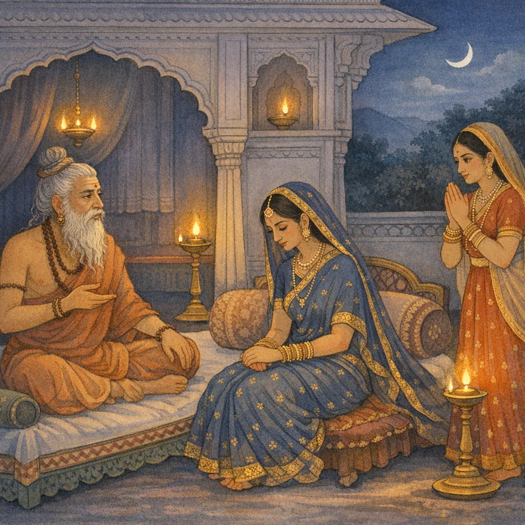 Chapter Arc: सत्यवती वंश-रक्षा के लिए कठोर किंतु अपरिहार्य उपाय—नियोग—का आदेश देती है; राजकुल की स्त्रियाँ भय, लज्जा और अनिश्चित भविष्य के बीच रात की प्रतीक्षा करती हैं। → कौसल्या को संदेश मिलता है कि ‘देवर’ (व्यास) निशीथ में आएँगे; वह शय्या पर लेटकर भीष्म और कुरुवंश के परिणामों का चिंतन करती है। दीपों के प्रकाश में व्यास का आगमन होता है, पर काशी-सुता (अम्बिका/अम्बालिका) भयवश दृष्टि न उठा सकने, रंग बदलने, या मन के संकोच से नियोग-धर्म निभाने में डगमगाती है। → व्यास नियोग-विधि से क्रमशः रानियों के पास जाते हैं; एक रानी भय से आँखें मूँद लेती है, दूसरी भय/विकार से पीली पड़ जाती है—और इन मानसिक अवस्थाओं की छाया गर्भफल पर पड़ती है; अंततः दासी निर्भय होकर ऋषि का सत्कार करती है और नियोग को स्थिरचित्त से स्वीकारती है। → व्यास मातृ-आज्ञा और वंश-धर्म से उऋण होकर सत्यवती को गर्भ-समाचार देकर अंतर्धान हो जाते हैं; विचित्रवीर्य के क्षेत्र में दैपायन से तीन पुत्र उत्पन्न होते हैं—कुरुवंश-वर्धक, देवगर्भ-प्रभा वाले। → तीनों पुत्रों के जन्म से वंश तो बचता है, पर उनके स्वभाव/शारीरिक-मानसिक लक्षण भविष्य के राज्य-कलह और उत्तराधिकार-संघर्ष की छाया डालते हैं।