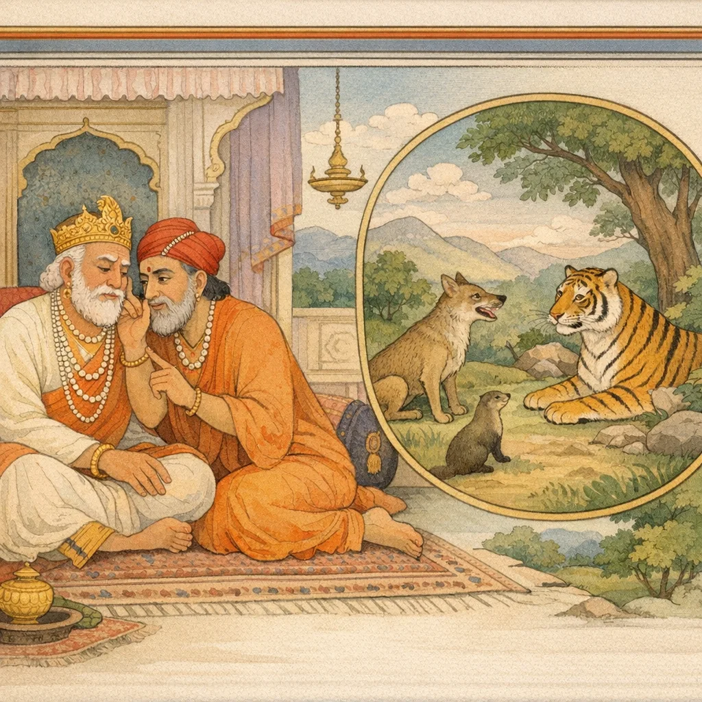 Kaṇika said: “O great king, listen. In this matter I shall recount an ancient tale about a forest-dwelling jackal—one who understood the true purport of political and ethical counsel—so that its lesson in statecraft and conduct may be grasped.”