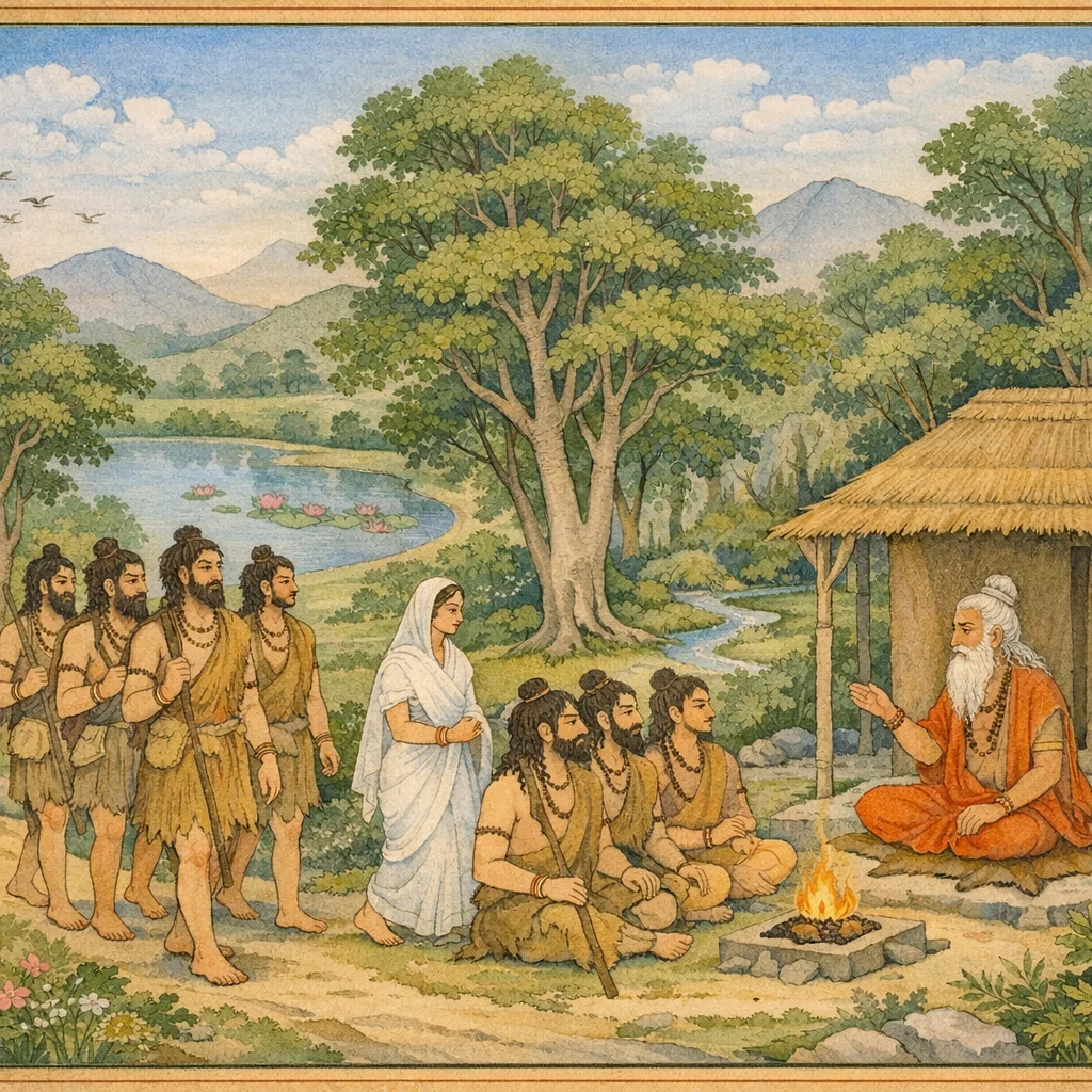 Chapter Arc: हिडिम्बवध के पश्चात वन-पथ पर चलते पाण्डव अनेक जनपदों—मत्स्य, त्रिगर्त, पंचाल और कीचक-प्रदेश—के रमणीय वन-उपवन, सरोवर और मार्गों को देखते हुए आगे बढ़ते हैं; पर यह सौन्दर्य उनके निर्वासन की छाया को ढँक नहीं पाता। → सुरक्षा और गोपनीयता हेतु वे जटाधारी, वल्कल-मृगचर्मधारी तपस्वियों का वेश धारण कर कुन्ती सहित भटकते हैं। लोक-जीवन के बीच से गुजरते हुए भी वे अपने तेज और शास्त्र-ज्ञान (वेद-उपनिषद्, वेदाङ्ग, नीतिशास्त्र) को भीतर सँभाले रखते हैं—राजधर्म और वनधर्म के बीच का द्वन्द्व तीव्र होता जाता है। → एकचक्रा में प्रवेश के प्रसंग में महर्षि वेदव्यास का साक्षात्कार होता है। व्यास पाण्डवों को आश्रय/निवास में ठहराकर स्नेहपूर्वक आश्वस्त करते हैं और उनके प्रति अपना विशेष अनुराग प्रकट करते हैं—यह संकेत देते हुए कि दीनता और बाल्यावस्था में मनुष्यों का स्नेह स्वाभाविकतः अधिक होता है, और पाण्डवों के प्रति उनका स्नेह अब और बढ़ गया है। → व्यास पाण्डवों को निर्देश देते हैं कि वे एक मास तक यहीं प्रतीक्षा करें; वे देश-काल का विचार कर पुनः लौटेंगे और तब उन्हें ‘परम मुद’ (श्रेष्ठ कल्याण/आनन्द) की प्राप्ति होगी। पाण्डव हाथ जोड़कर आज्ञा स्वीकार करते हैं और व्यास यथागत प्रस्थान करते हैं। → एक मास की प्रतीक्षा के बाद व्यास क्या योजना/उपाय लेकर लौटेंगे—और एकचक्रा में पाण्डवों पर कौन-सा नया संकट या अवसर उतरने वाला है?