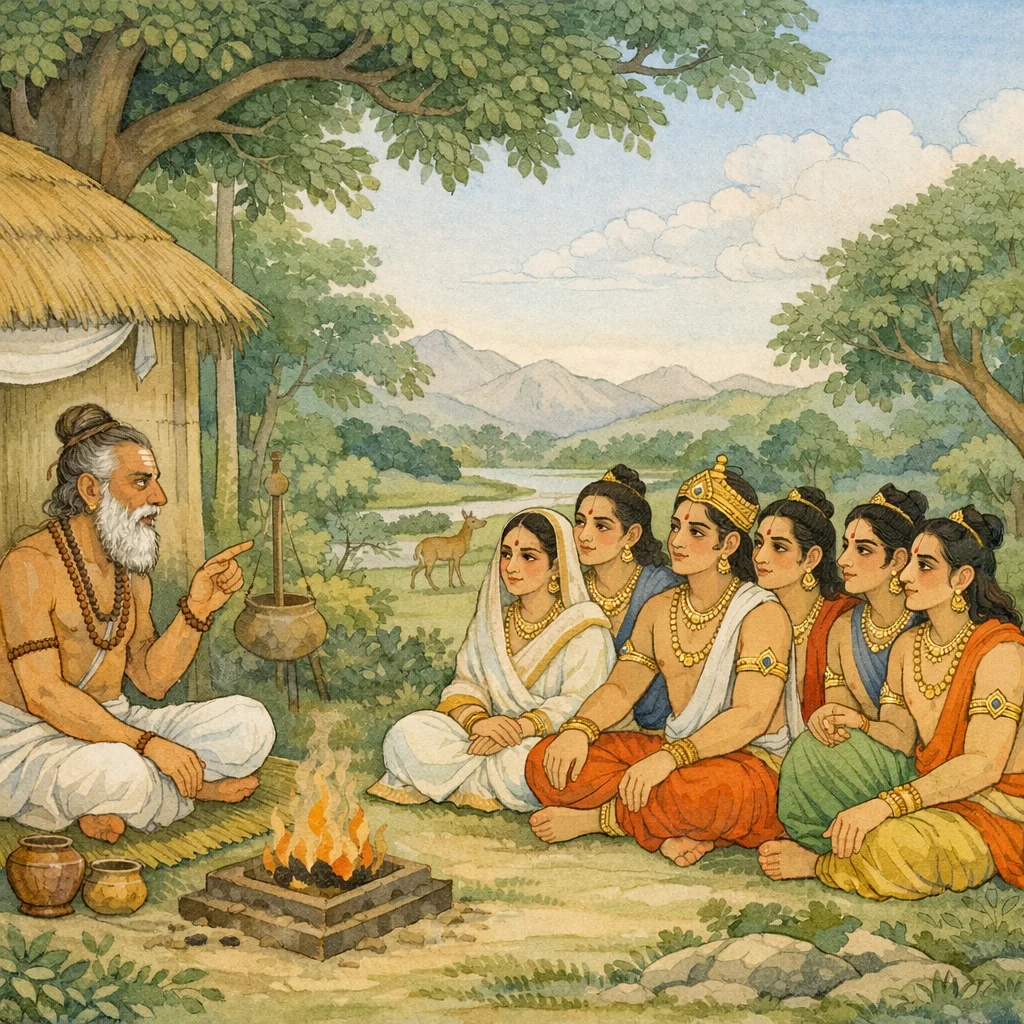 Chapter Arc: बकासुर-वध के बाद पाण्डव कुन्ती सहित उसी ब्राह्मण के गृह में ठहरते हैं; वहीं एक कठोर-व्रती ब्राह्मण अतिथि बनकर आता है और शुभ कथाओं का प्रवाह आरम्भ होता है। → वह ब्राह्मण देशों, तीर्थों, नदियों, राजाओं और अद्भुत घटनाओं का वर्णन करते-करते पंचाल में घटे एक ‘अद्भुताकार’ स्वयंवर की ओर संकेत करता है—जहाँ याज्ञसेनी (कृष्णा) का भाग्य और राजधर्म की प्रतिष्ठा दाँव पर है। → कथान्त में ब्राह्मण द्रुपद के महायज्ञ से धृष्टद्युम्न, शिखण्डी और अयोनिजा कृष्णा की उत्पत्ति तथा याज्ञसेनी-स्वयंवर का रहस्य खोलता है; पाण्डवों की जिज्ञासा तीव्र होकर प्रश्न बनती है—धृष्टद्युम्न ने द्रोण से अस्त्र-शिक्षा कैसे पाई और वे दोनों मित्र क्यों भिन्न हुए? → पाण्डवों के पूछने पर (वैशम्पायन के कथनानुसार) वह ब्राह्मण द्रौपदी-सम्भव और पंचाल-प्रसंग का क्रमबद्ध वृत्तान्त सुनाने को प्रस्तुत होता है—कथा का द्वार खुलता है, पर पूरा विवरण अगले प्रवाह में जाएगा। → द्रौपदी-सम्भव का वृत्तान्त आरम्भ होने ही वाला है—द्रुपद-द्रोण वैर, यज्ञ-उत्पत्ति और स्वयंवर की निर्णायक शर्तें आगे क्या रूप लेंगी?