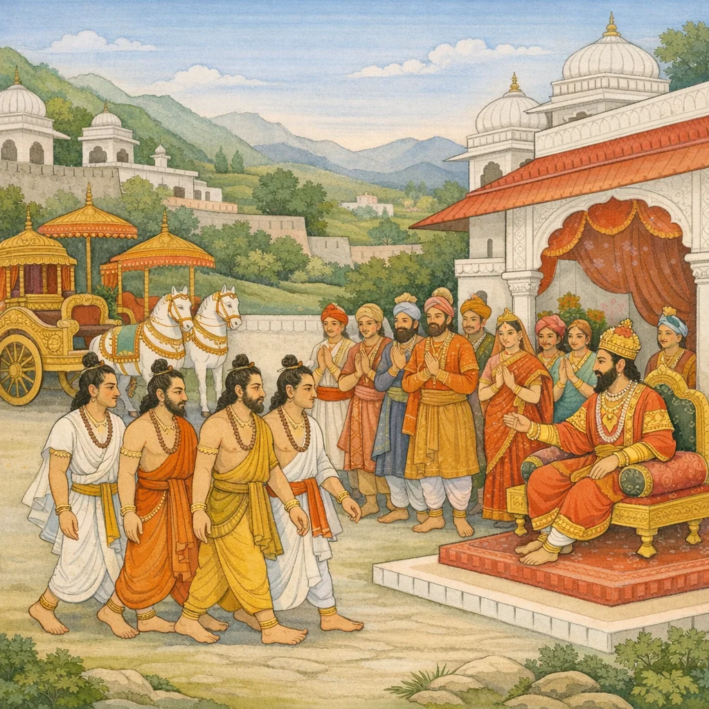 Chapter Arc: पुरोहित के वचनों और पाञ्चाल-आमंत्रण के संकेतों के बीच पाण्डवों का रथों पर आरूढ़ होकर द्रुपद-निवास की ओर प्रस्थान—एक अनजान परीक्षा का द्वार खुलता है। → युधिष्ठिर जिज्ञासा-वश अनेक द्रव्य, क्रीड़ा-सामग्री और आवश्यक वस्तुएँ जुटवाते हैं; कुन्ती और कृष्णा सहित सब एकत्र होकर राजकीय वैभव के साथ आगे बढ़ते हैं, पर भीतर-भीतर यह आशंका रहती है कि पाञ्चाल-राजसभा उन्हें किस दृष्टि से देखेगी—अतिथि या प्रत्याशी? → द्रुपद के भवन में पाण्डवों की सिंह-सी चाल, गूढ़ कंधे, भुजगेन्द्र-भोग-से दीर्घ बाहु और ऋषि-सा वेश देखकर राजा, मंत्री, पुत्र, सचिव और जनसमुदाय हर्ष से उमड़ पड़ते हैं—उनकी वीरता और कुलीनता का मौन प्रमाण सभा के सामने प्रकट हो जाता है। → द्रुपद-पुत्र तथा द्रुपद सहित समस्त राजपरिवार और अमात्यगण प्रसन्न होकर कुन्ती-सुतों का स्वागत-सत्कार करते हैं; पाण्डव पाञ्चाल-गृह में सम्मानित अतिथि के रूप में प्रतिष्ठित होते हैं। → यह सत्कार केवल अतिथि-धर्म है या द्रौपदी-स्वयंवर से पूर्व ‘परीक्षा’ का प्रथम चरण—अगला निर्णय अभी शेष है।