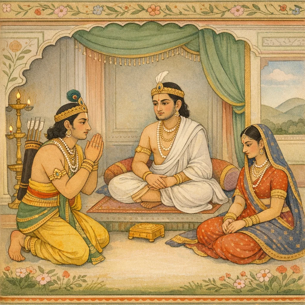 Chapter Arc: नियम-भंग का बोझ लेकर धनंजय धर्मराज से कहता है—मैंने आपको द्रौपदी के साथ देखकर प्रतिज्ञा तोड़ी; अब वनवास ही मेरा प्रायश्चित्त है। → पाँचों पाण्डवों और कृष्णा के बीच प्रेम, एकता और मर्यादा का सूक्ष्म संघर्ष उभरता है—एक ओर भ्रातृ-स्नेह रोकना चाहता है, दूसरी ओर क्षत्रिय-धर्म और वचन-पालन अर्जुन को आगे धकेलते हैं। साथ ही ‘राजा कर ले पर रक्षा न करे तो पापी’ जैसी उक्ति राज्य-धर्म की कठोर कसौटी याद दिलाती है, मानो यह अध्याय भी धर्म के लेखे-जोखे में बँधा हो। → अर्जुन का निर्णायक वचन—‘वनवासो गमिष्यामि… समयो हि नः कृतः’—और उसी क्षण उसका घर-गृहस्थी, भाई-बंधु, तथा द्रौपदी के निकट सुख को त्यागकर तीर्थयात्रा/वनगमन के लिए उठ खड़ा होना। → धर्मराज की आज्ञा/स्वीकृति के साथ अर्जुन का प्रस्थान निश्चित होता है; कथा का केंद्र अब हस्तिनापुर के अंतःपुर से हटकर वन, तीर्थ और यात्रा के अनुशासन पर टिक जाता है। → अर्जुन की तीर्थयात्रा में कौन-सा प्रसंग उसे महान अस्त्रों, मित्रताओं और आगामी संघर्षों की ओर ले जाएगा—यह प्रश्न अगले अध्यायों के लिए द्वार खोल देता है।