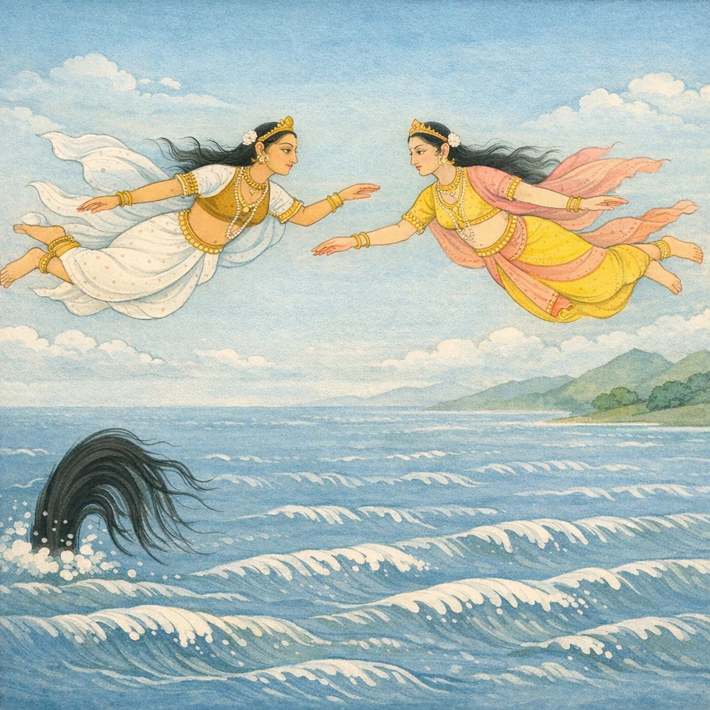Chapter Arc: उग्रश्रवा सौति सुनाते हैं कि कद्रू और विनता के बीच उच्चैःश्रवा के वर्ण-विवाद से उपजा दांव अब निर्णायक घड़ी की ओर बढ़ रहा है—और नागगण अपनी माता कद्रू को जिताने हेतु गुप्त युक्ति रचते हैं। → नाग परस्पर ‘कर्तव्यम्’ का निश्चय कर लेते हैं: वे घोड़े की पूँछ में काले बाल बनकर लिपटेंगे ताकि पूँछ काली प्रतीत हो और कद्रू का पक्ष सत्य लगे। इसी बीच दोनों बहनें—दाक्षायणी कद्रू और विनता—आकाशमार्ग से समुद्र-तट की ओर बढ़ती हैं, जहाँ शर्त का निर्णय होना है। → समुद्र-दर्शन का विराट क्षण: वे उस अथाह, गर्जनशील, वायु-वेग से क्षोभित, मकरों और तिमिंगिलों से भरे, रत्न-निधान, वरुण-आलय और नाग-आवास—सरिताओं के स्वामी महासागर—को प्रत्यक्ष देखती हैं; लहरें नृत्य करती-सी उठती हैं और पाताल-ज्वाला-सी दीप्ति गहराइयों में चमकती प्रतीत होती है। → नागों की छल-योजना सफल होने की दिशा में स्थापित हो जाती है—वे पूँछ में ‘वाला इव’ स्थित हो चुके हैं; और कद्रू-विनता समुद्र के ‘परं पारं’ तक पहुँचकर शर्त के निर्णयन हेतु उपस्थित हो जाती हैं। → अब जब स्थान और छल दोनों तैयार हैं, क्या विनता सत्य के बल पर जीत पाएगी—या नागों की कपट-रचना उसे दासी-भाव में बाँध देगी?