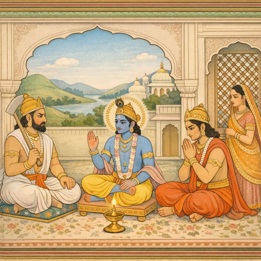Chapter Arc: द्वारका में अर्जुन–सुभद्रा-विवाह के बाद यदुवंश के भीतर उठी शंकाएँ और मान-अपमान की चर्चा—क्या पाण्डव ने सात्वतों का अपमान किया, या उन्हें उचित सम्मान दिया? → कुल-गौरव और धन-लोभ की आशंकाएँ सामने आती हैं—कुछ लोग मानते हैं कि पाण्डव स्वयंवर को ‘अनाधृष्य’ (अजेय/अस्पर्श्य) समझते हैं और सात्वतों को अर्थलुब्ध नहीं मानते; इसी बीच बलराम का क्रोध और कुल-प्रतिष्ठा का प्रश्न वातावरण को तीखा बनाता है। → कृष्ण की नीति और वाणी से यह निर्णायक बिंदु आता है कि अर्जुन ने कुल का अपमान नहीं किया; उलटे, उचित सम्मान और मर्यादा का पालन हुआ—और इसी आधार पर बलराम के क्रोध का शमन तथा विवाह की स्वीकृति का मार्ग खुलता है। → विवाह को सामाजिक-धार्मिक मान्यता मिलती है; दहेज/उपहारों का प्रवाह ‘समुद्र में नदी-प्रवाह’ की तरह वर्णित होता है, और अर्जुन का इन्द्रप्रस्थ लौटना तथा यदुओं का स्नेह-सम्बन्ध स्थिर होता है। → इन्द्रप्रस्थ में नववधू के आगमन और द्रौपदी द्वारा स्वागत/आशीर्वाद की ओर कथा बढ़ती है (अगले प्रसंग में गृहस्थ-धर्म और सह-धर्मिणी संबंधों की नई परीक्षा)।