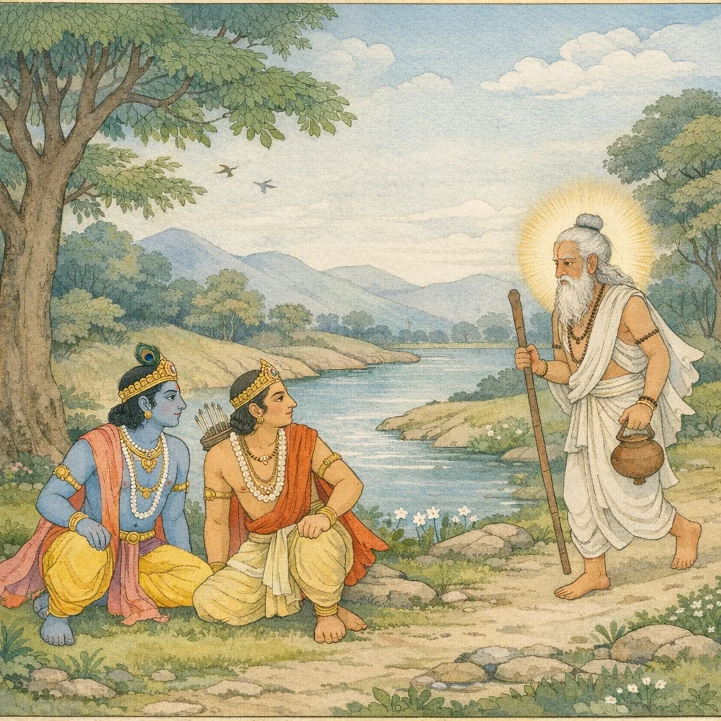 Chapter Arc: धर्मराज युधिष्ठिर के धर्ममय राज्य में प्रजा ऐसे सुख से रहती है जैसे देहधारी अपने ही शरीर में सुरक्षित रहता हो—इसी शांत समृद्धि के बीच कृष्ण और अर्जुन का एक साधारण-सा जलविहार आरम्भ होता है। → कृष्ण-अर्जुन वन-उपवन के निकट प्रसन्न बैठे हैं कि तभी एक अद्भुत तेजस्वी ब्राह्मण (वास्तव में अग्नि) प्रकट होता है—तरुण सूर्य-सा दहकता, जटाधारी, चीरवस्त्रधारी; उसका आगमन शांति में असामान्य कम्पन भर देता है। → तेजस्वी द्विज के निकट आते ही अर्जुन और वासुदेव आदरपूर्वक उठ खड़े होते हैं—यह क्षण संकेत देता है कि कोई दिव्य याचना/कार्य सामने है, जो सामान्य राजसुख को अचानक महाकाव्य-घटना में बदल देगा। → अध्याय का समापन इस स्थापना पर होता है कि धर्मराज के राज्य की पृष्ठभूमि में कृष्ण-अर्जुन के समक्ष एक दिव्य अतिथि उपस्थित है; आगे की कथा उसी के प्रयोजन पर टिकती है। → ब्राह्मण-रूपधारी का वास्तविक अभिप्राय क्या है, और वह कृष्ण-अर्जुन से कौन-सा असाध्य कार्य करवाना चाहता है?