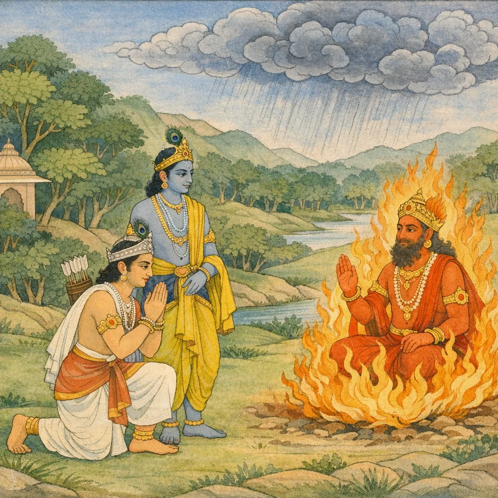 Chapter Arc: खाण्डववन-दाह की योजना में अग्नि अपने पूर्व-पराभव का वृत्तान्त और बाधा का संकेत देता है—इन्द्र की वर्षा से वह बार-बार रोका गया है; अब उसे ऐसे सहायक चाहिए जो देव-वर्षा को भी निष्फल कर दें। → अग्नि ब्रह्मा के पास जाकर ‘यथान्याय’ सब निवेदन करता है; ब्रह्मा विचार कर उपाय बताता है कि उचित काल-क्षण और समर्थ मानव-वीर के सहारे ही खाण्डव दहेगा। उधर अर्जुन अपनी व्यावहारिक कठिनाइयाँ रखता है—उसके बाहुबल के अनुरूप धनुष नहीं, अक्षय बाणों का भार साधारण रथ नहीं ढो सकता, और कृष्ण के पराक्रम के तुल्य आयुध भी चाहिए। → अर्जुन सीधे लक्ष्य पर आता है: ‘भगवन्, ऐसा उपाय बताइये जिससे मैं इन्द्र की वर्षा को रोक सकूँ’—यानी देव-शक्ति के प्रतिरोध का संकल्प, और साथ ही दिव्य अस्त्र-शस्त्र/रथ/अश्व की माँग, ताकि अग्नि का कार्य सिद्ध हो। → अग्नि अर्जुन-कृष्ण की शर्तों और आवश्यकताओं को स्वीकारते हुए उन्हें ‘करणानि समर्थानि’ देने की दिशा में संवाद को स्थिर करता है—पुरुषार्थ वे करेंगे, साधन वह उपलब्ध कराएगा; इस प्रकार खाण्डव-दाह की तैयारी निर्णायक रूप से आगे बढ़ती है। → दिव्य साधनों का वास्तविक दान और इन्द्र-वर्षा के विरुद्ध प्रत्यक्ष प्रतिरोध अगले प्रसंग में फूटने को है—क्या मनुष्य-वीर देव-राज की वर्षा को रोक पाएँगे?