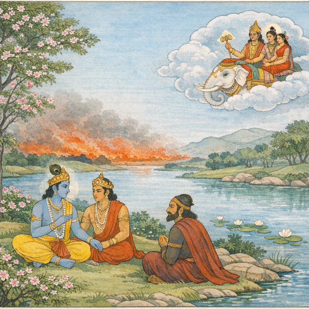 Chapter Arc: खाण्डव-दाह के बाद यमुना-तट पर अग्निदेव की आज्ञा से कृष्ण, अर्जुन और मय—तीनों एक साथ बैठते हैं; दाह की धधकती स्मृति के बीच वरदानों का प्रसंग उठता है। → अग्निदेव अपने वचन और कुन्ती की धर्मज्ञता का स्मरण कराते हुए अर्जुन-कृष्ण को आश्वस्त करते हैं कि उनके प्रति कोई संताप न रहे; फिर अर्जुन इन्द्र से ‘सर्वशः’ दिव्यास्त्रों की याचना करता है, पर इन्द्र समय-शर्त रखकर प्रतीक्षा कराते हैं। → इन्द्र का निर्णायक वचन—‘जब महादेव प्रसन्न होंगे, तब मैं तुम्हें पाण्डवास्त्राणि सर्वशः दूँगा’—अर्जुन के भविष्य-तप और शिव-प्रसाद को अस्त्र-प्राप्ति की अनिवार्य शर्त बना देता है। → अग्नि के जगत्-हितकारी दाह के बाद तीनों का नदीकूले उपवेशन, आश्वासन और वर-प्रदान की रूपरेखा तय होती है; अर्जुन के लिए अस्त्र-मार्ग स्पष्ट हो जाता है—पहले शिव-आराधना, फिर इन्द्र से पूर्ण दिव्यास्त्र। → इन्द्र द्वारा बताए गए ‘वह समय कब आएगा’ का संकेत अर्जुन को आगामी महान् तपस्या और महादेव-साक्षात्कार की ओर धकेलता है—अस्त्र-प्राप्ति अभी स्थगित है, मार्ग आगे खुलता है।