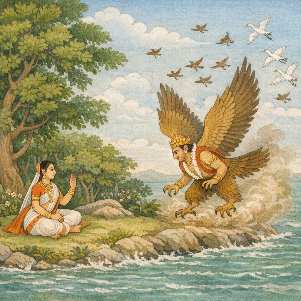 Then Vinatā spoke again, driven by a mother’s deep affection for her son. Though she knew his incomparable might, she remained intent on offering blessings—speaking words meant to protect and guide him through what lay ahead.