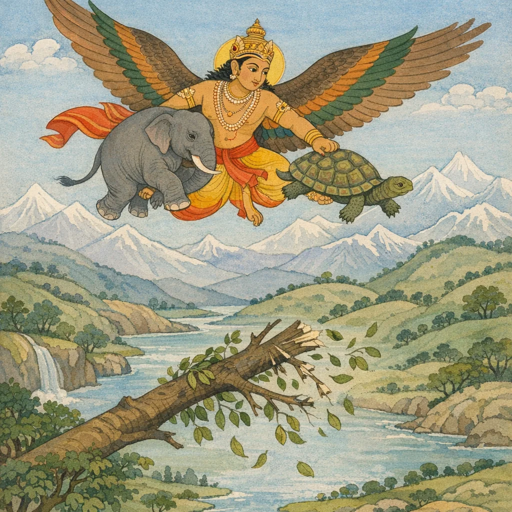 With one talon he seized an elephant, and with the other a tortoise. Then that mighty bird sprang up into the sky and soared aloft. In the narrative, Garuḍa’s tremendous strength is shown as guided by remembrance of his father’s instruction—power placed in the service of a vowed purpose rather than mere display.