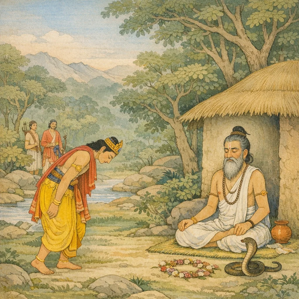 The wise sage did not say anything to him—neither praise nor blame. Remaining free from anger, he stayed just as before, calmly seated, still bearing the dead snake upon his shoulder.