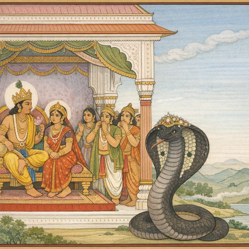Sauti recounts an additional ‘marvel’ from the Āstīka narrative: Takṣaka, distressed, does not fall into the blazing ritual fire, having been associated with Indra’s protection. When questioned about how the mantras of the officiants could fail to consummate the rite, Sauti explains that Āstīka repeatedly commands the serpent to ‘stand’ (tiṣṭha), suspending Takṣaka mid-air. Pressed by the assembly, Janamejaya accepts Āstīka’s words as binding, orders the rite to be concluded, and expresses satisfaction with the boon’s fulfillment. The narrative records communal acclaim, the king’s distribution of gifts to priests and functionaries, and the proper avabhṛtha (concluding bath) performed according to rule. Āstīka is respectfully dismissed, invited to return as a member of a future aśvamedha, and he reports the outcome to his mother and maternal uncle. The nāgas, relieved, offer Āstīka a boon; he requests that those who recite this dharma-account morning and evening be free from fear of serpents. A brief phalaśruti affirms the protective merit of remembering specific nāga names and of hearing/reciting the Āstīka account.