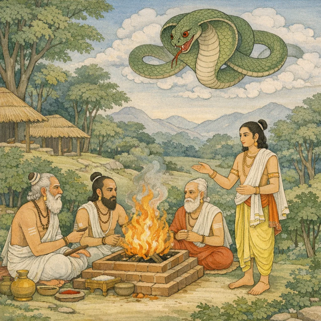 Chapter Arc: उग्रश्रवा सूत शौनक को आस्तीक के विषय में एक और ‘अत्यद्भुत’ प्रसंग सुनाते हैं—यज्ञाग्नि की प्रचण्ड ज्वाला के बीच तक्षक का भयाक्रान्त होकर भी न गिर पाना और राजा जनमेजय का क्षण-क्षण बदलता संकल्प। → सर्पसत्र की विधिवत् दीप्त अग्नि में आहुतियाँ पड़ रही हैं; मन्त्रबल से नाग खिंचते चले आते हैं, पर तक्षक—इन्द्र के आश्रय/हस्त से छूटकर भी—आकाश में अटका-सा रह जाता है। यह असामान्य रुकावट राजा के मन में चिन्ता और उत्कंठा बढ़ाती है: क्या यज्ञ पूर्ण होगा या किसी धर्म-सीमा पर आकर ठहर जाएगा? → आस्तीक के वचन और याचना से यज्ञ-प्रवाह थमता है; सर्पों का संहार-चक्र रुकता है और राजा जनमेजय प्रसन्न होकर आस्तीक को वर देता है—यही क्षण सर्पसत्र के उग्र लक्ष्य पर करुणा और धर्म का निर्णायक विजय-क्षण बनता है। → राजा ‘कृतकृत्य’ मनीषी आस्तीक को सम्मानपूर्वक सुसंस्कृत गृह की ओर प्रेषित करता है; विधिदृष्ट कर्म से अवभृथ-स्नान आदि समापन-कर्म सम्पन्न होते हैं। आस्तीक की कीर्ति ‘जरत्कारु-जात’ रक्षक के रूप में स्थिर होती है—जिसने सर्पसत्र में पन्नगों की रक्षा की।