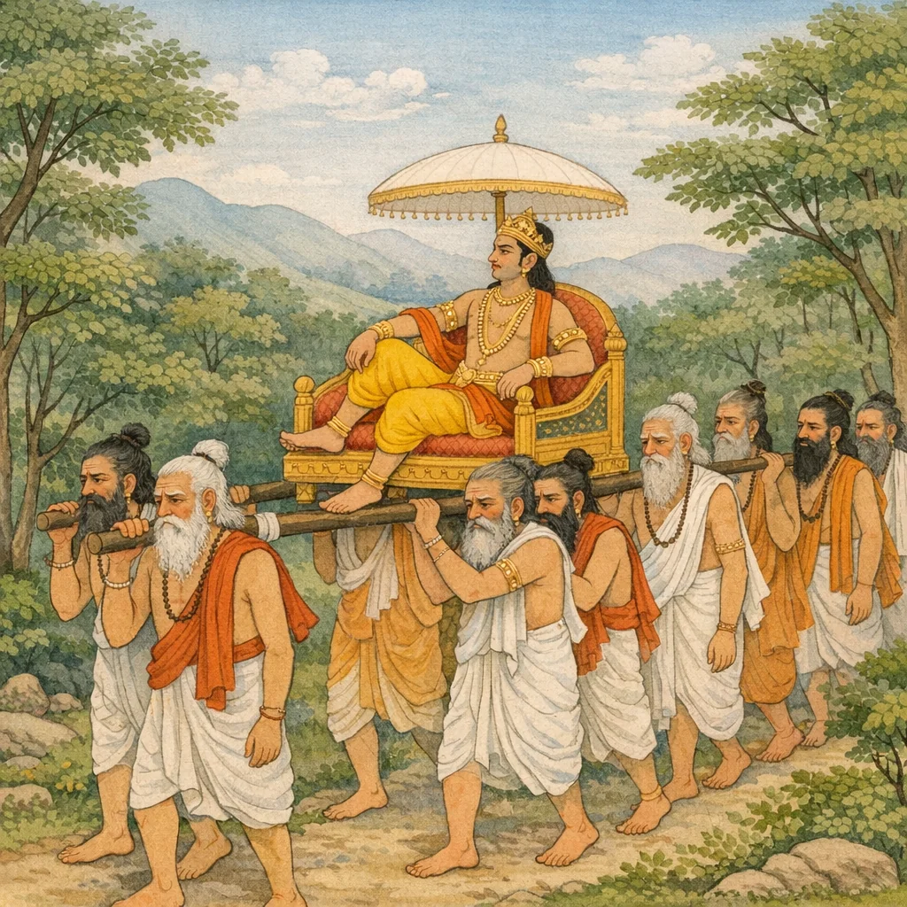 Vaiśampāyana said: Then the king, taking on Pūru’s age, entered youth once more. And Pūru, having assumed Yayāti’s age, administered the kingdom on Yayāti’s behalf. The episode reveals the moral weight of filial duty and self-sacrifice, and the ethical tension between a ruler’s personal desire and the rightful burdens of kingship.