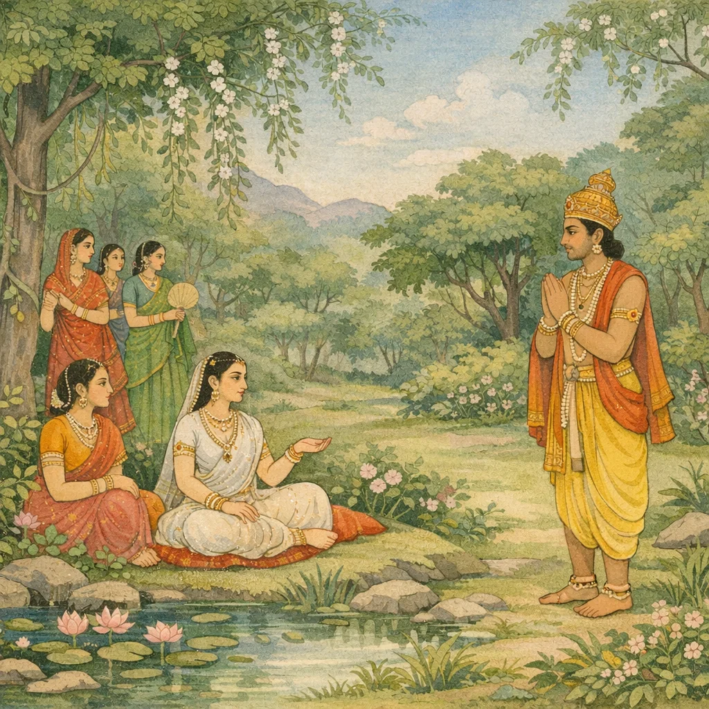 Chapter Arc: वन-प्रदेश में सखियों और दासियों के साथ देवयानी तथा शर्मिष्ठा का विहार—उसी एकांत में राजा ययाति का आगमन, मानो भाग्य स्वयं दो कुलों को आमने-सामने ले आया हो। → देवयानी ‘विधान’ (दैव-नियत) की बात कहकर प्रसंग को ऊँचा उठाती है, फिर ययाति से पूछती है कि वह इस वन में किस प्रयोजन से आया है। संवाद के भीतर ही संकेत उभरता है कि यह भेंट साधारण नहीं—यह विवाह, राजनीति और भविष्य की संतति-रेखा को मोड़ने वाली है। → देवयानी ययाति से स्पष्ट निवेदन करती है कि वह उसकी रक्षा-आश्रय बने—‘सखा, भर्ता’ बने—और साथ ही वह शर्मिष्ठा (वृषपर्वा की पुत्री) को भी ययाति के संरक्षण में सौंपते हुए मर्यादा-सीमा रखती है: उसका सत्कार हो, पर उसे शय्या पर न बुलाया जाए। → शुक्राचार्य की स्वीकृति और सम्मान के साथ ययाति को देवयानी, शर्मिष्ठा तथा दासियों/कन्याओं के साथ विदा किया जाता है; ययाति प्रसन्न होकर अपने नगर लौटता है—विवाह-संबंध स्थापित, पर भीतर एक निषिद्ध-रेखा भी खींच दी गई। → देवयानी की शर्त—‘शर्मिष्ठा को शय्या पर न बुलाना’—भविष्य के संघर्ष का बीज बनकर रह जाती है: क्या राजा वचन निभा पाएगा, या काम-धर्म और राज-धर्म की टकराहट अनिवार्य है?