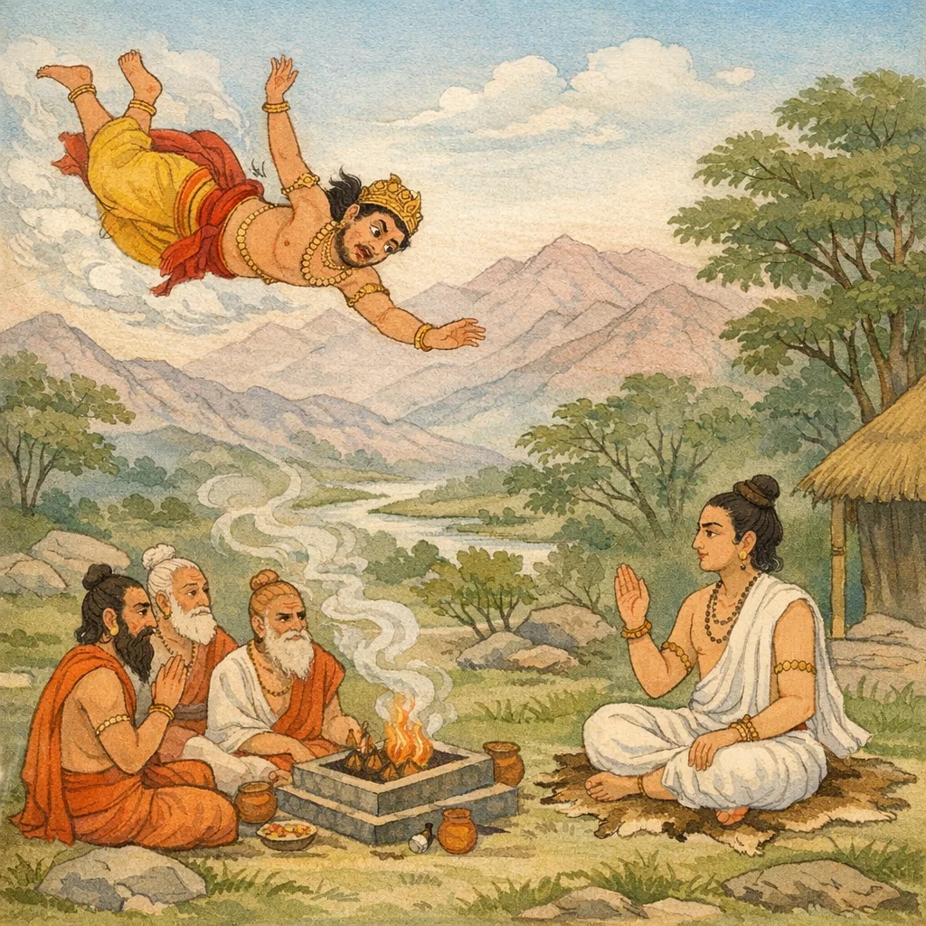 Chapter Arc: स्वर्गलोक में पुण्य-क्षय से डगमगाते हुए राजा ययाति अपना परिचय देते हैं—‘मैं नहुष-पुत्र ययाति, पूरु का पिता’—और सत्पुरुषों के बीच गिर पड़ने की लज्जा से काँप उठते हैं। → ययाति और अष्टक के बीच ‘वृद्धि’ का मानदण्ड उठता है: क्या पूज्यता केवल आयु से आती है, या विद्या-तप-जन्म-शील से? अष्टक आयु-गौरव को काटते हैं और धर्म-आचरण, विनय, वेदाध्ययन, यज्ञ, तप तथा अहंकार-शून्यता को श्रेष्ठता का आधार बताते हैं। → अष्टक का निर्णायक उपदेश—धन से हर्ष न हो, दुःख से तपन न हो; धीर पुरुष समभाव से रहे, ‘दिष्टं बलीय’ मानकर न हर्षित हो न शोकाकुल—ययाति के स्वर्ग-पतन की पीड़ा को सीधे धर्म-दर्शन में रूपान्तरित कर देता है। → ययाति बताते हैं कि वे प्रजापति के दुर्लभ लोक में दीर्घकाल रहे, पर पुण्य क्षीण होने पर पतन निश्चित हुआ; पतन-क्षण में देवताओं ने उन्हें अष्टक आदि की यज्ञभूमि का संकेत दिया, और वे हवि-गन्ध व धूम-चिह्नों का अनुसरण कर वहाँ पहुँचे—यानी पतन भी सत्संग और यज्ञ-धर्म की ओर ले जाने वाला मार्ग बन गया। → ययाति अब यज्ञभूमि पर उपस्थित हैं—आगे यह तय होना शेष है कि सत्पुरुषों/यजमानों के साथ संवाद और पुण्य-विनिमय से उनका पतन रुकेगा या नया धर्म-निर्णय जन्म लेगा।