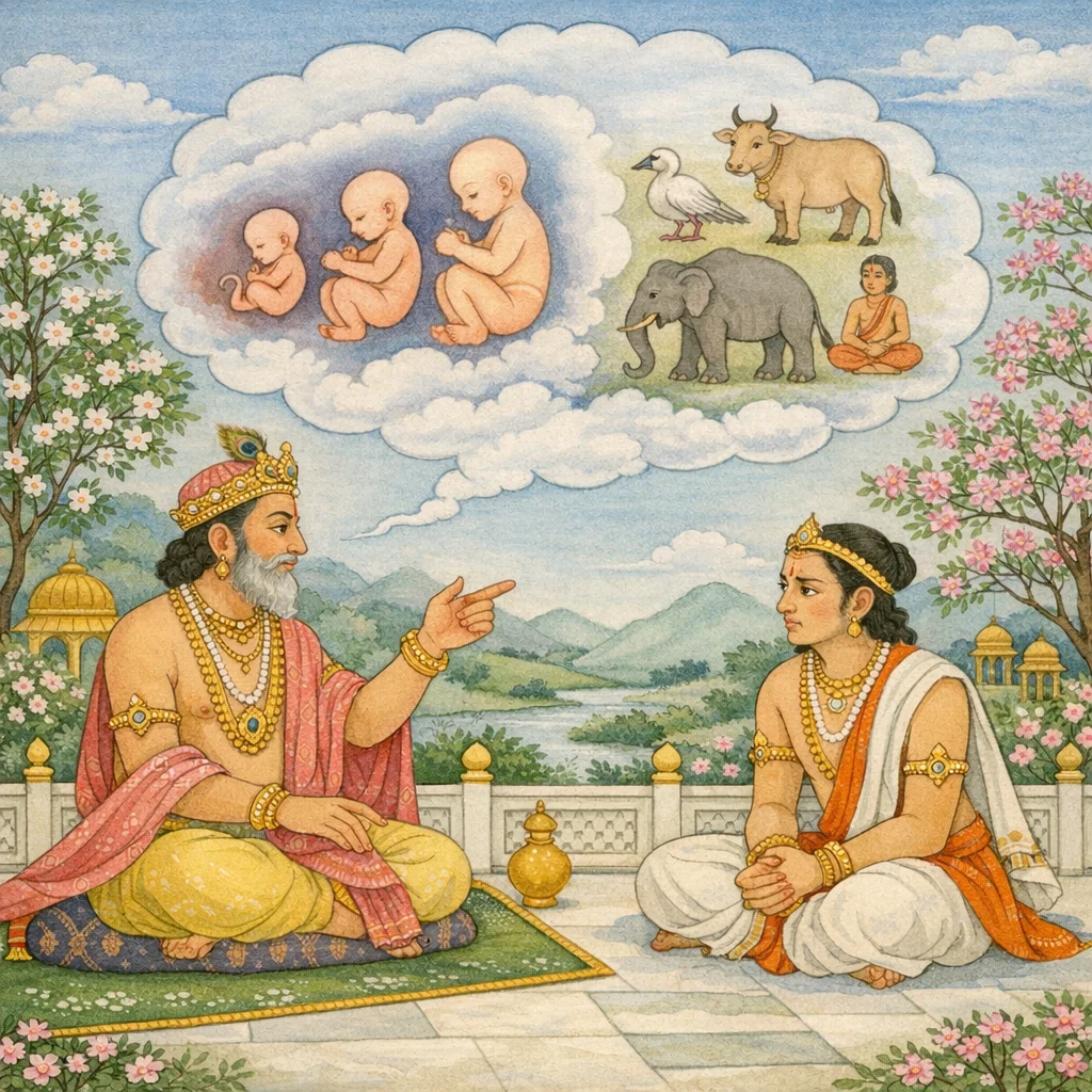 Aṣṭaka said: “O king, tell me this clearly. When a being comes to enter the human womb, does it arrive bearing the very same body it had before, or does it assume another body? I ask because I am beset by doubt, and I seek to understand the hidden truth of how embodied life takes birth.”