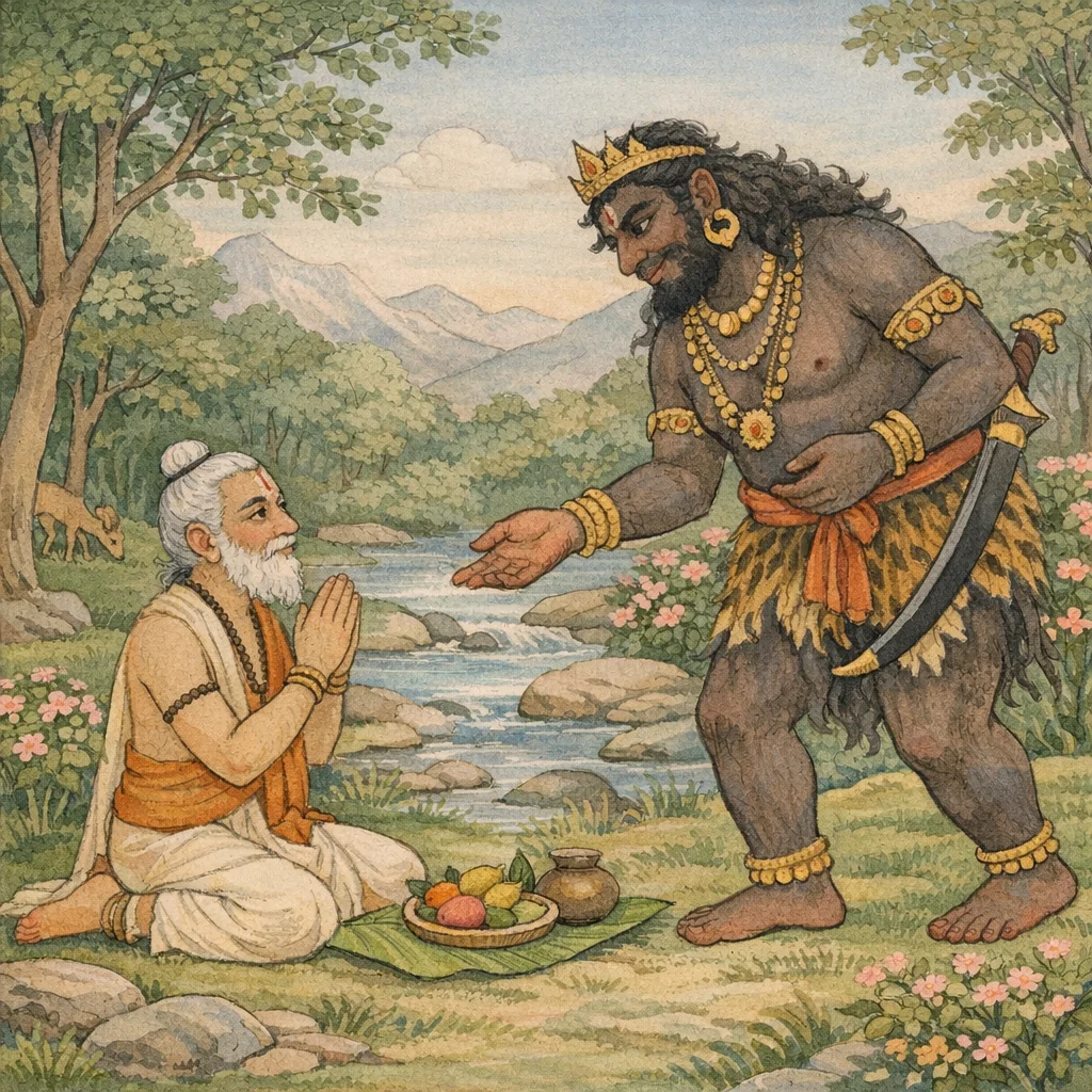 Chapter Arc: धर्मचिन्ता से भरे एक वेदज्ञ ब्राह्मण को देखकर कथानक आरम्भ होता है—वह विद्वानों को भी इन्द्रियों के अधीन और वेद-विरुद्ध कर्मों में प्रवृत्त देख कर भीतर-ही-भीतर व्याकुल है। → ब्राह्मण की यह चिन्ता केवल उपदेश नहीं रहती; वह अपने आचरण से ‘धर्म’ को जीवित करने का प्रयत्न करता है। इसी क्रम में उसका सामना एक राक्षस से होता है—जहाँ भय, अविश्वास और हिंसा की सम्भावना स्वाभाविक रूप से बढ़ती जाती है। → ब्राह्मण राक्षस का समादर कर उसे ‘अतिथि/मान्य’ की भाँति पूजता है; प्रत्युत्तर में राक्षस भी सम्मानित होकर ब्राह्मण का प्रत्युपकार करता है—उसे मित्र बनाता है और अर्थ-सहायता/उपकार देकर मुक्त करता है। → कथा यह स्थापित करती है कि सत्कार, संयम और धर्मनिष्ठ व्यवहार—even भयावह प्रतीत होने वाले प्राणी में भी—सद्भाव जगाकर हिंसा को मैत्री में बदल सकता है; दान-धर्म का प्रभाव केवल वस्तु-दान नहीं, ‘मान-दान’ भी है।