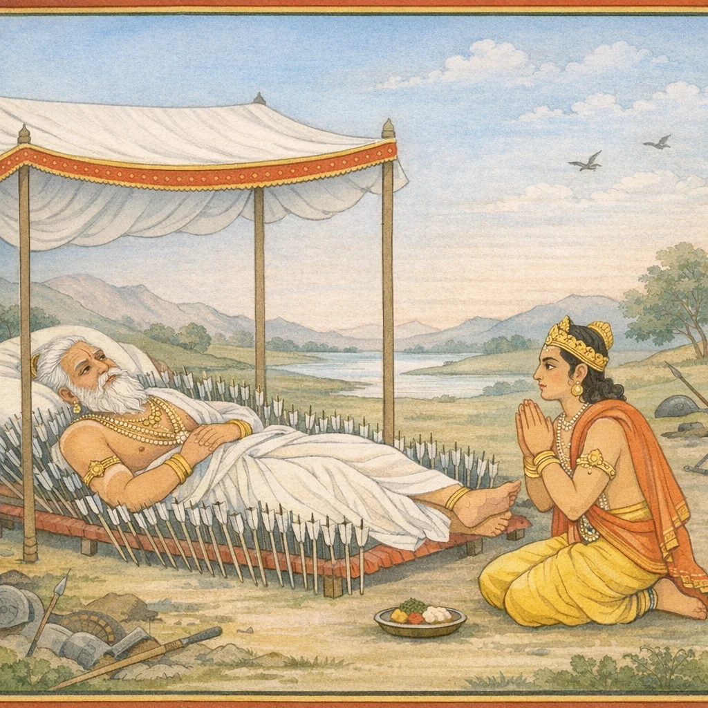 Chapter Arc: युधिष्ठिर, दान-धर्म के सूक्ष्म मार्ग में एक और कठिन प्रश्न उठाते हैं—किनके अन्न का ग्रहण धर्म है और किनके अन्न का ग्रहण पतन का द्वार? → भीष्म वर्ण-धर्म और आचरण-धर्म के आधार पर ‘भोज्य’ और ‘अभोज्य’ का वर्गीकरण करते हैं—ब्राह्मण, क्षत्रिय, वैश्य के अन्न की ग्राह्यता; शूद्र-भोजन के निषेध का कठोर विधान; और उससे भी आगे ‘सर्वभक्ष’, ‘विकर्मी’, ‘न्यासापहारी’, ‘कृतघ्न’ जैसे आचरण-दोषों से दूषित अन्न के परिणाम। → भीष्म का तीखा निष्कर्ष—“शूद्रों का अन्न खाने वाला पृथ्वी का मल खाता है; और जो द्विज शूद्र-भोजी हैं वे भी वही मल खाते हैं”—यह वाक्य अध्याय का नैतिक-आघात और भय-उत्पादक शिखर बनता है, जहाँ भोजन केवल पदार्थ नहीं, धर्म-शुद्धि का निर्णायक बन जाता है। → भीष्म पुनः स्मरण कराते हैं कि समाज-धर्म में ब्राह्मण का स्वाध्याय, क्षत्रिय का रक्षण, वैश्य का पोषण-व्यवहार—ये कर्तव्य-रेखाएँ हैं; और अन्न-ग्रहण में भी शुद्धि का नियम उसी व्यवस्था को साधता है। अंत में वे कहते हैं कि ‘भोज्य-अभोज्य’ का विधान विधिपूर्वक कह दिया गया। → युधिष्ठिर के लिए द्वार खुला छोड़ दिया जाता है—“कौन्तेय, अब और क्या सुनना चाहते हो?” (अगले प्रश्न/उपदेश की ओर संकेत)