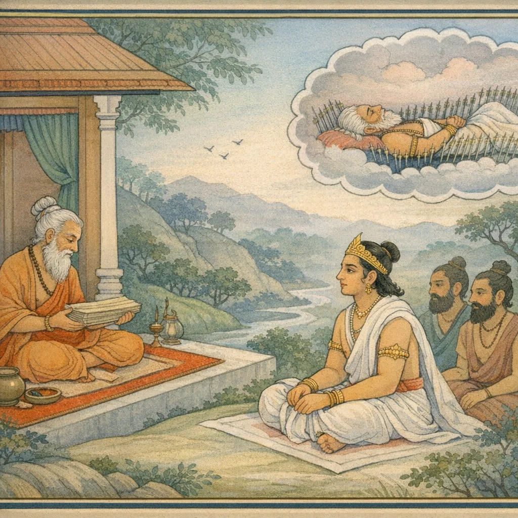 Chapter Arc: भीष्म-युधिष्ठिर संवाद की दीर्घ धारा के बाद कथा स्वयं अपने ग्रन्थ-स्वरूप की ओर मुड़ती है—‘व्यास-निर्मित श्रीमहाभारत’ की शतसाहस्री संहिता का स्मरण, और अनुशासनपर्व के भीतर ‘भीष्मस्वर्गारोहणपर्व’ में दानधर्म का प्रतिपादन। → उपदेश के विषय (दानधर्म) से आगे बढ़कर श्रोता-समाज के सामने एक और प्रश्न उभरता है—यह विशाल ग्रन्थ किस प्रकार रचा, गाया और छन्दों में बाँधा गया? संहिता, पर्व, अध्याय, श्लोक-गणना और छन्द-रचना का संकेत कथा को ‘समापन’ की ओर खींचता है। → अनुशासनपर्व के ‘सम्पूर्णम्’ होने की उद्घोषणा—ग्रन्थ के एक महापर्व का औपचारिक समापन, और साथ ही महाभारत की रचना-परम्परा (अनुष्टुप तथा अन्य बड़े छन्दों, अक्षर-गणना) का संक्षिप्त, पर निर्णायक, उल्लेख। → दानधर्म तथा भीष्म-युधिष्ठिर संवाद के प्रसंगों को अनुशासनपर्व के अन्तर्गत समेटकर, पाठ-परम्परा के संकेतों सहित पर्व-समाप्ति स्थापित होती है; श्रोता को यह बोध मिलता है कि उपदेश-खंड का एक चरण पूर्ण हुआ। → भीष्मस्वर्गारोहणपर्व की स्मृति यह संकेत देती है कि उपदेश के बाद ‘प्रस्थान/उत्क्रमण’ का भाव आगे गूँजेगा—भीष्म के अन्तिम गमन और उसके प्रभाव की छाया शेष कथा पर पड़ेगी।