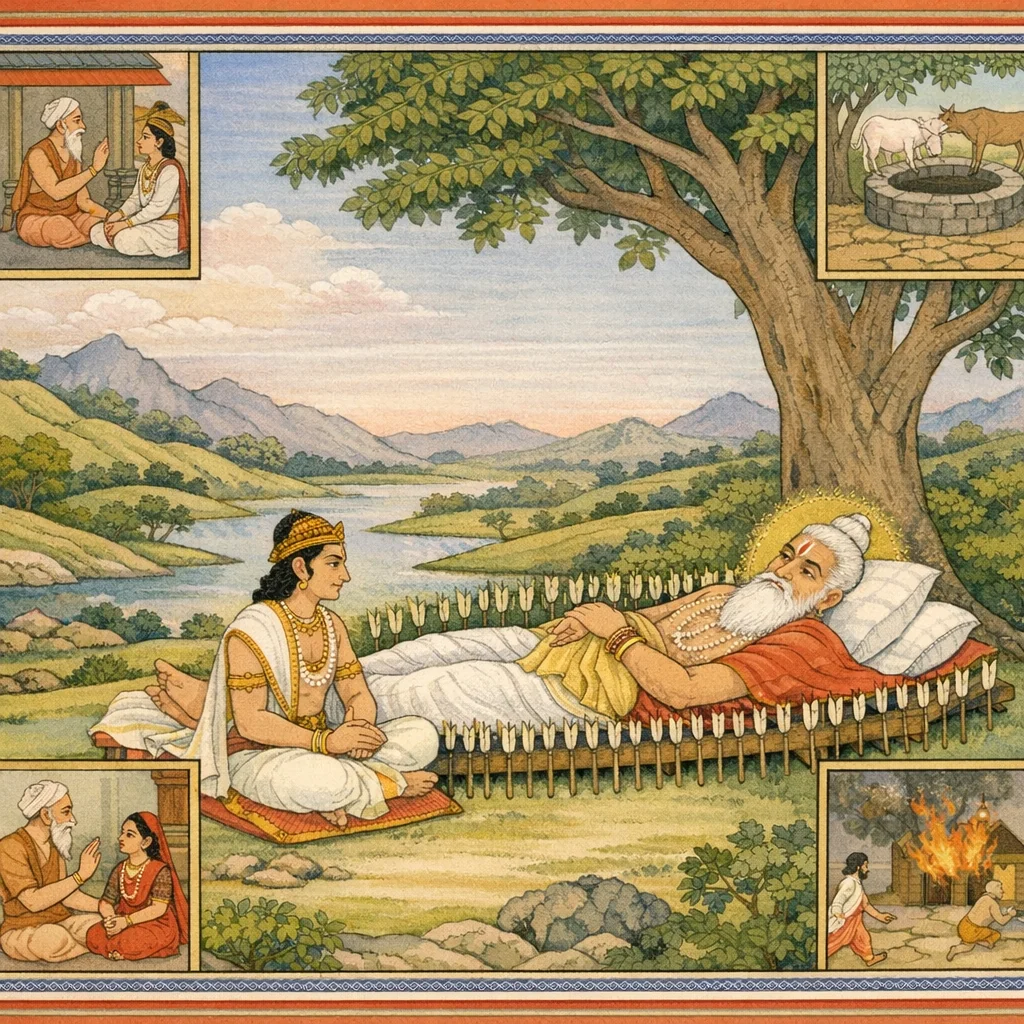 Chapter Arc: शान्ति के बाद के उपदेश-प्रसंग में भीष्म युधिष्ठिर से कहते हैं कि वे एक प्राचीन प्रश्न का उत्तर सुनें—ऐसे कौन-से कर्म हैं जो प्रत्यक्ष वध किए बिना भी ‘ब्रह्महत्या’ के तुल्य पाप बन जाते हैं। → भीष्म स्मरण कराते हैं कि उन्होंने कभी धर्म-निपुण व्यास से यह रहस्य पूछा था—अहिंसा का आवरण ओढ़कर भी ब्रह्मघ्नता कैसे घटित होती है। फिर वे एक-एक करके ऐसे सामाजिक-अन्याय गिनाते हैं: भूख से टूटे ब्राह्मण को ‘कुछ नहीं’ कहकर टालना, प्यास से व्याकुल गौओं के जल में बाधा डालना, योग्य वर होते हुए भी कन्या का विवाह न करना, ब्राह्मणों को अकारण मर्मभेदी शोक देना, असहाय/विकल ब्राह्मण की वस्तु हर लेना, और मोहवश आश्रम-वन-ग्राम-नगर में आग लगा देना। → सूची का नैतिक शिखर तब आता है जब ‘अहिंसा’ की परिभाषा उलट जाती है—यह स्पष्ट किया जाता है कि जीवन-रक्षा, आश्रय-रक्षा, अन्न-जल-रक्षा और ब्राह्मण-कल्याण में बाधा डालना भी ब्रह्मघात के समान है; पाप का केन्द्र ‘कर्म की हिंसा’ नहीं, ‘धर्म-रक्षा में विफलता’ बन जाता है। → भीष्म व्यास-वचन के आधार पर निष्कर्ष देते हैं कि जो व्यक्ति दीन, प्यासे, असहाय और धर्माश्रितों की रक्षा में बाधक बनता है, वह ब्रह्मघाती समझा जाए—क्योंकि वह समाज के धर्म-स्तम्भों को गिराता है। → अगले उपदेश के लिए संकेत रहता है कि अब इन पापों के प्रायश्चित्त/दान-धर्म और प्रतिकार-धर्म की विधियाँ आगे कही जाएँगी।