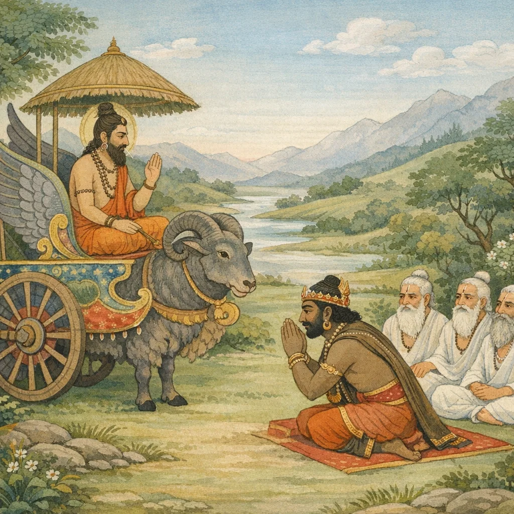 Bhishma said: Once, Shakra (Indra), assuming an unrecognized disguise, became a matted-haired ascetic marked by the quality of rajas. Mounting an ungainly chariot, he went to the asura Shambara and, on reaching him, put a question—setting the stage for a test of understanding and conduct rather than a display of force.