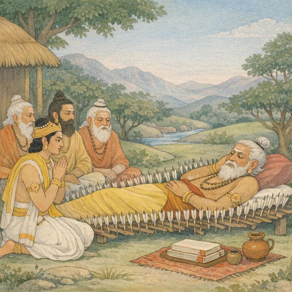 Chapter Arc: युधिष्ठिर, पितामह भीष्म को ‘सर्वशास्त्रविधानज्ञ’ कहकर प्रणाम करता है और एक तीक्ष्ण संशय रखता है—पिता के धन में पुत्रों का दायभाग किस प्रकार निश्चित होता है, विशेषतः जब जन्म-वर्ण और मातृ-वर्ण भिन्न हों। → प्रश्न साधारण उत्तर से आगे बढ़कर वर्ण-संकर, अनुलोम-प्रतिलोम, और विभिन्न मातृ-गर्भों से उत्पन्न पुत्रों के अधिकार तक पहुँचता है; भीष्म स्मृति-नियमों के अनुसार हिस्सों की सीमा, पात्रता और अपात्रता का क्रमशः विधान करते हैं, जिससे न्याय और कठोरता का द्वंद्व उभरता है। → भीष्म निर्णायक रूप से दायभाग की मर्यादाएँ बताते हैं—विशेषकर शूद्रा से ब्राह्मण के पुत्र के लिए ‘अल्प’ और ‘दशमांश से अधिक नहीं’ जैसी सीमाएँ, तथा वर्ण-क्रम की असमानता (एक वर्ण का दूसरे के ‘सदृश’ न होना) को आधार बनाकर उत्तराधिकार का कठोर वर्गीकरण। → युधिष्ठिर के संशय का शास्त्रीय समाधान प्रस्तुत होता है: पिता के धन का विभाजन जन्म-स्थिति, मातृ-वर्ण, और स्वीकृत सामाजिक-धर्म-व्यवस्था के अनुसार होता है; अधिकार ‘समता’ पर नहीं, ‘विधि’ पर टिकता है। → भीष्म के विधान के बाद भी एक मौन प्रश्न शेष रहता है—क्या शास्त्र-सम्मत असमानता ही धर्म है, या धर्म का कोई उच्चतर मानदंड भी है?