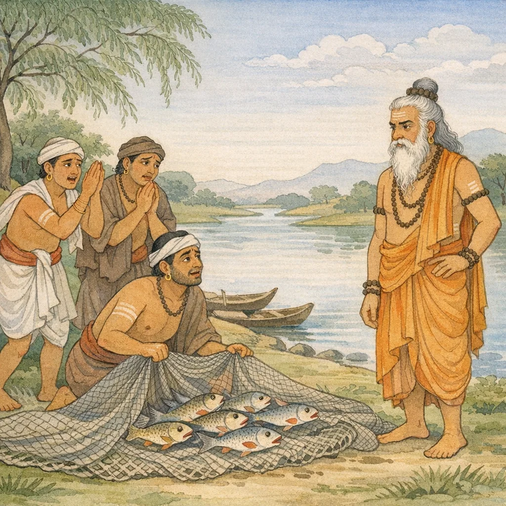 Chapter Arc: युधिष्ठिर के प्रश्न के उत्तर में भीष्म गौओं की महिमा के प्रसंग से एक प्राचीन वृत्तान्त छेड़ते हैं—नहुष और महर्षि च्यवन का संवाद, जिसमें करुणा और धर्म का असाधारण संगम होने वाला है। → महर्षि च्यवन, महान् व्रतधारी और सर्वभूतहितैषी, जलचरों तक को आश्रय देने वाले चन्द्रमा-सम शीतल स्वभाव से नदी-तट पर रहते हैं। उधर निषाद मछलियों के लिए विस्तृत, नव-सूत्रकृत जाल जल में डालते हैं; जलचर परस्पर संहृष्ट होकर उसमें फँसते जाते हैं। → जाल खींचे जाने पर मछलियाँ स्थल-संस्पर्श से त्रस्त होकर व्याकुल होने लगती हैं; उसी जाल के साथ महर्षि च्यवन भी नदी से बाहर आ जाते हैं। मुनि का निर्णायक वचन गूँजता है—वे जल में बसे इन मत्स्यों का साथ छोड़ने को तैयार नहीं: ‘मैं इन मछलियों के साथ ही प्राण-त्याग या प्राण-रक्षा करूँगा; इनके बिना नहीं रहूँगा।’ → मुनि के इस अद्भुत संकल्प से निषाद भय-कम्पित हो उठते हैं, विवर्ण मुख से जाकर राजा नहुष को समस्त घटना निवेदित करते हैं—अब राजधर्म की परीक्षा निकट है। → नहुष तक समाचार पहुँच चुका है; क्या वह मुनि और जलचरों के प्रति करुणा-धर्म निभाएगा, या राज्य-हित/आजीविका के तर्क से निषादों का पक्ष लेगा?
